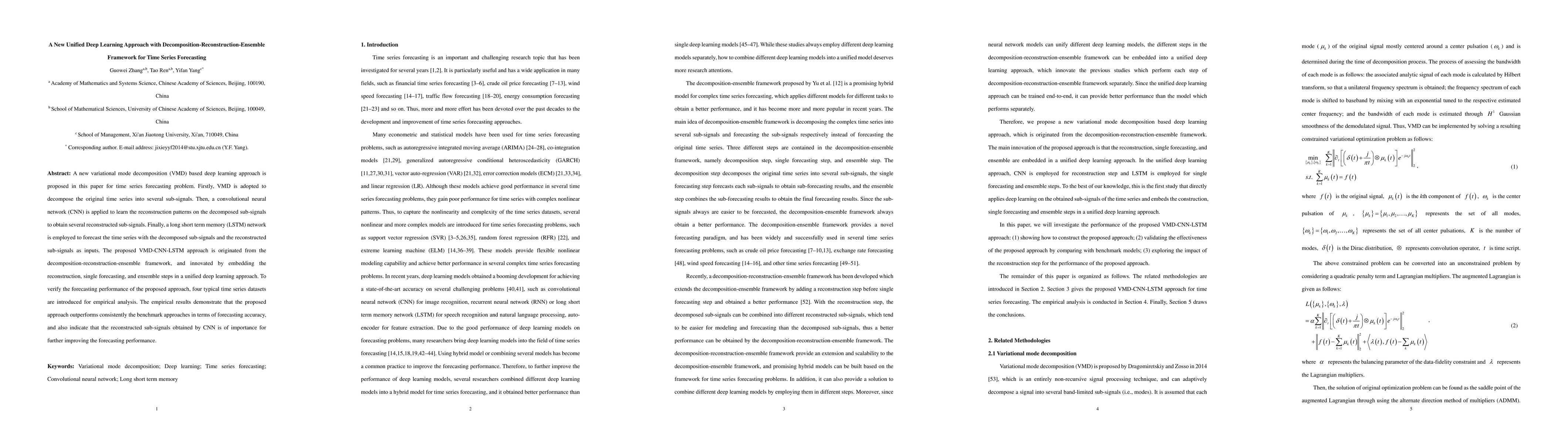 The paper proposes a novel VMD-CNN-LSTM deep learning approach for time series forecasting using a decomposition-reconstruction-ensemble framework. The empirical results show that this unified method outperforms existing benchmarks in forecasting accuracy.