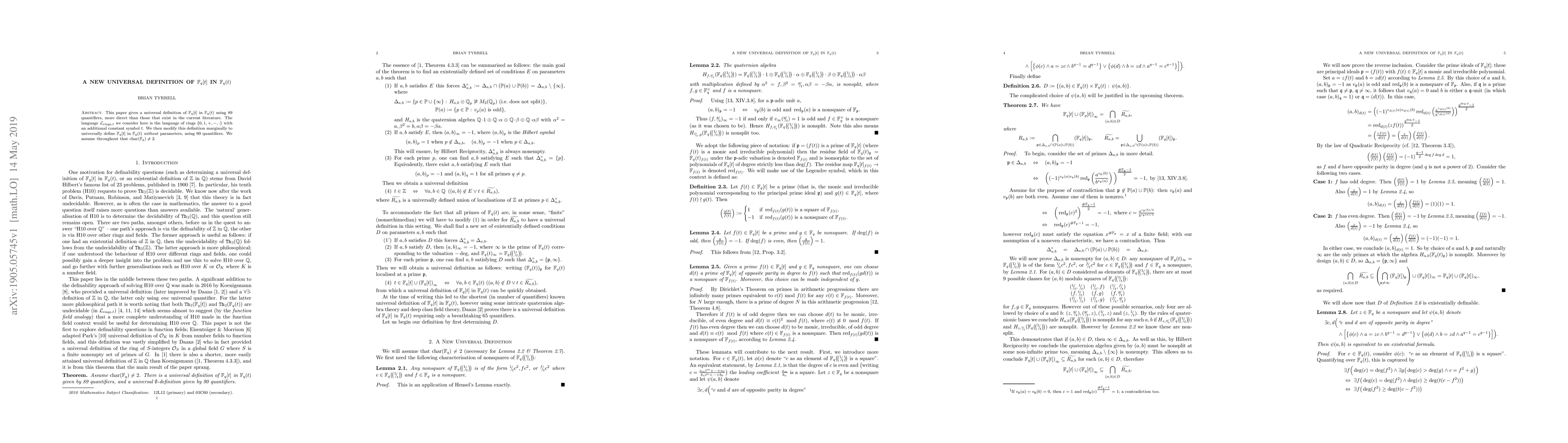 This paper presents a novel, more direct universal definition of $\mathbb{F}_q [t]$ within $\mathbb{F}_q (t)$ using 89 quantifiers, and extends it to a parameter-free definition with 90 quantifiers, employing the language of rings with an additional constant symbol $t$. The characteristic of $\mathbb{F}_q$ is assumed to be odd.