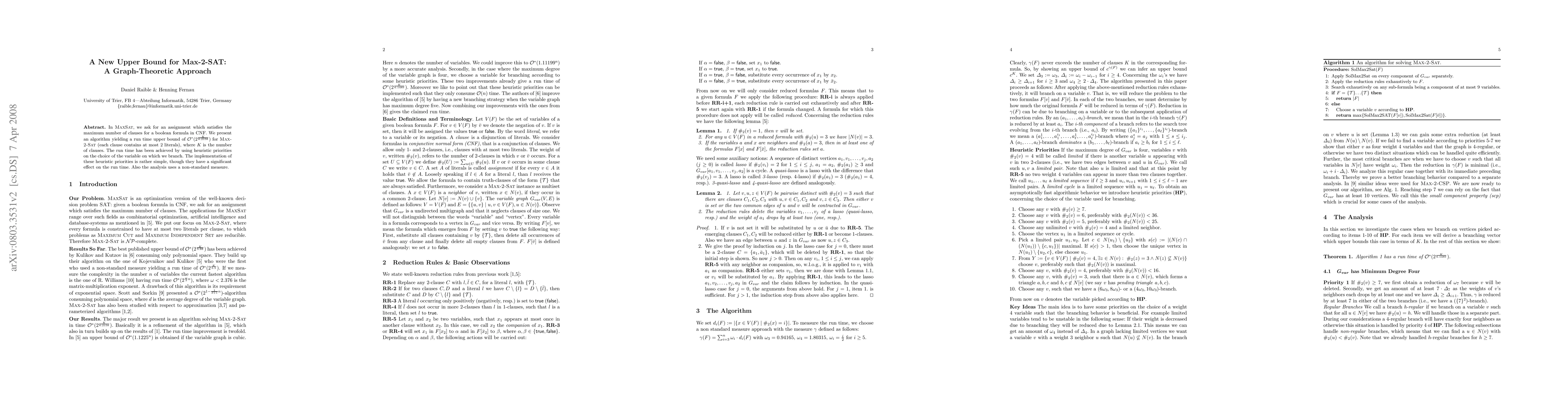 In {\sc MaxSat}, we ask for an assignment which satisfies the maximum number of clauses for a boolean formula in CNF. We present an algorithm yielding a run time upper bound of $O^*(2^{\frac{1}{6.2158}})$ for {\sc Max-2-Sat} (each clause contains at most 2 literals), where $K$ is the number of clauses. The run time has been achieved by using heuristic priorities on the choice of the variable on which we branch. The implementation of these heuristic priorities is rather simple, though they have a significant effect on the run time. The analysis is done using a tailored non-standard measure.