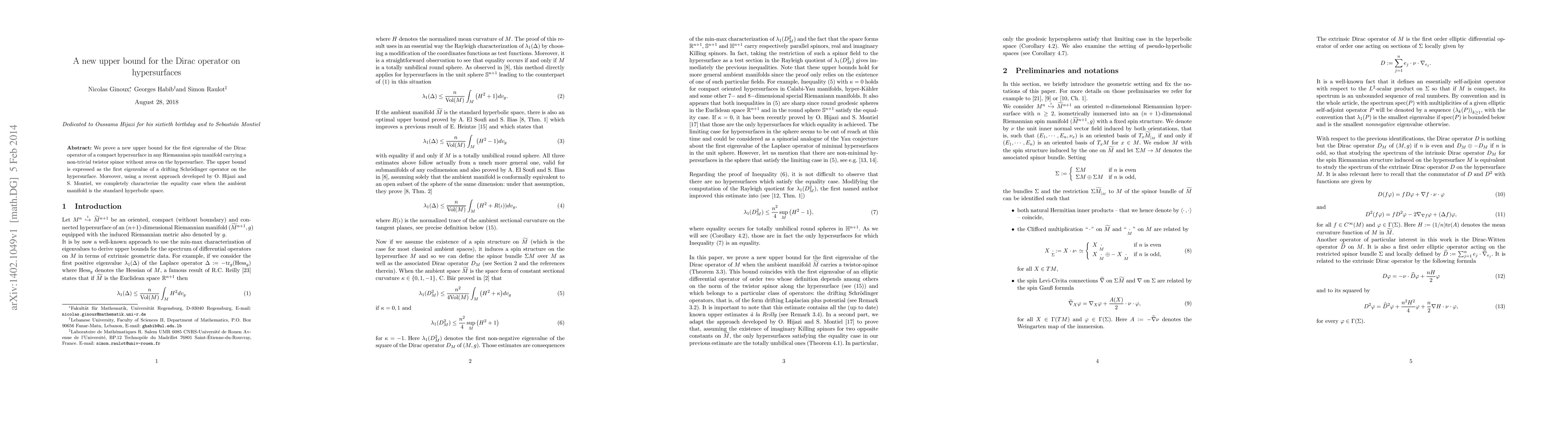 This paper establishes a new upper bound for the first eigenvalue of the Dirac operator on compact hypersurfaces in Riemannian spin manifolds, expressed via the first eigenvalue of a drifting Schrödinger operator. It also characterizes the equality case when the ambient manifold is standard hyperbolic space using methods by Hijazi and Montiel.