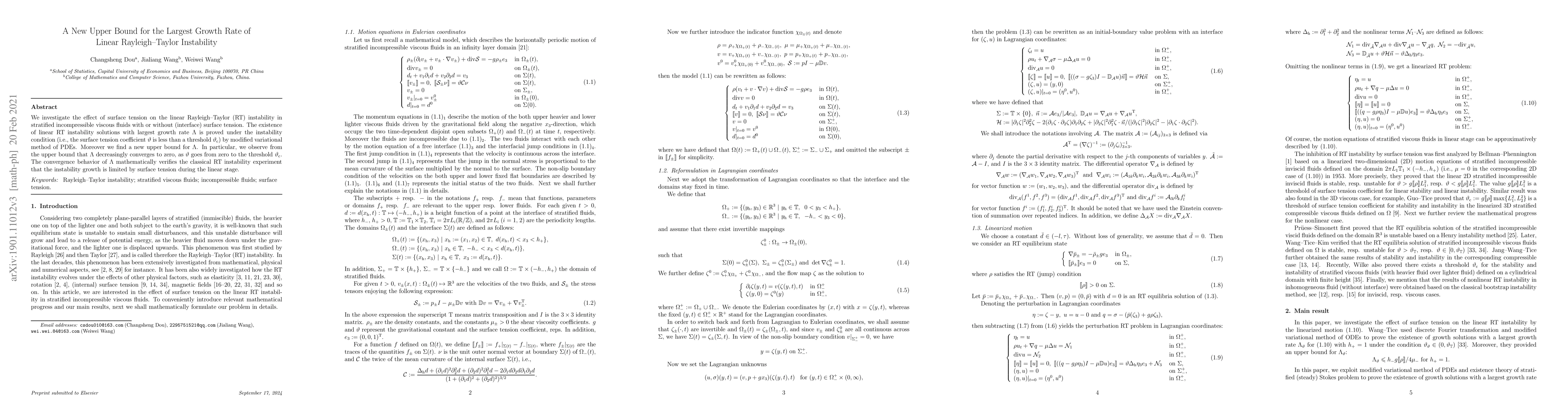 Researchers investigate how surface tension affects linear Rayleigh-Taylor instability in fluids and find a new upper bound for the largest growth rate of instability, showing that it decreases as surface tension increases.