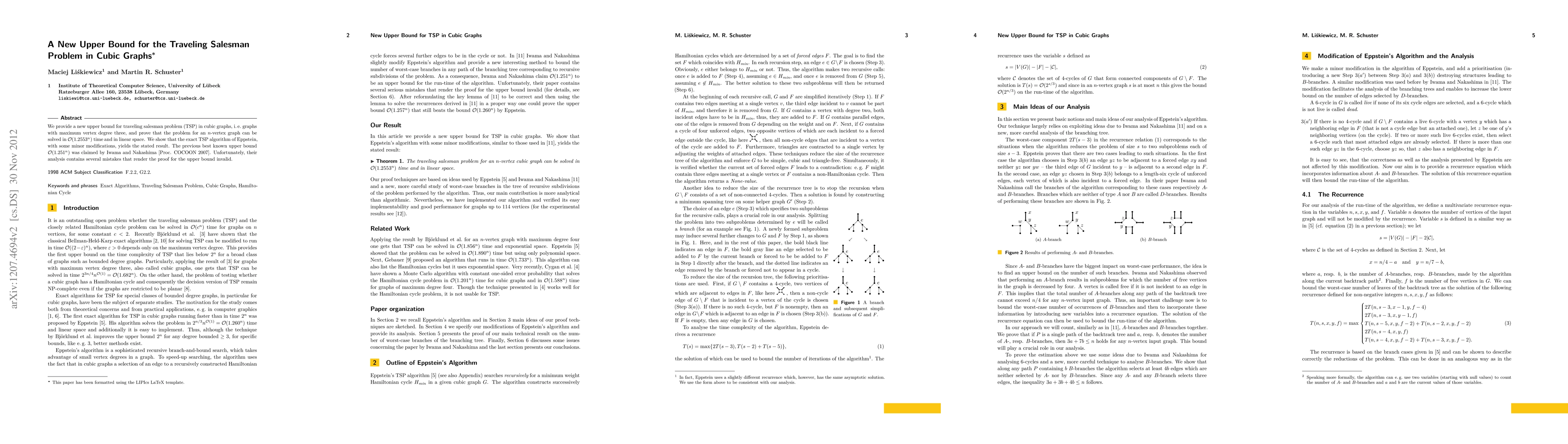 Researchers found a new upper bound for solving the Traveling Salesman Problem in cubic graphs, with an efficient algorithm that solves it in O(1.2553^n) time and linear space.