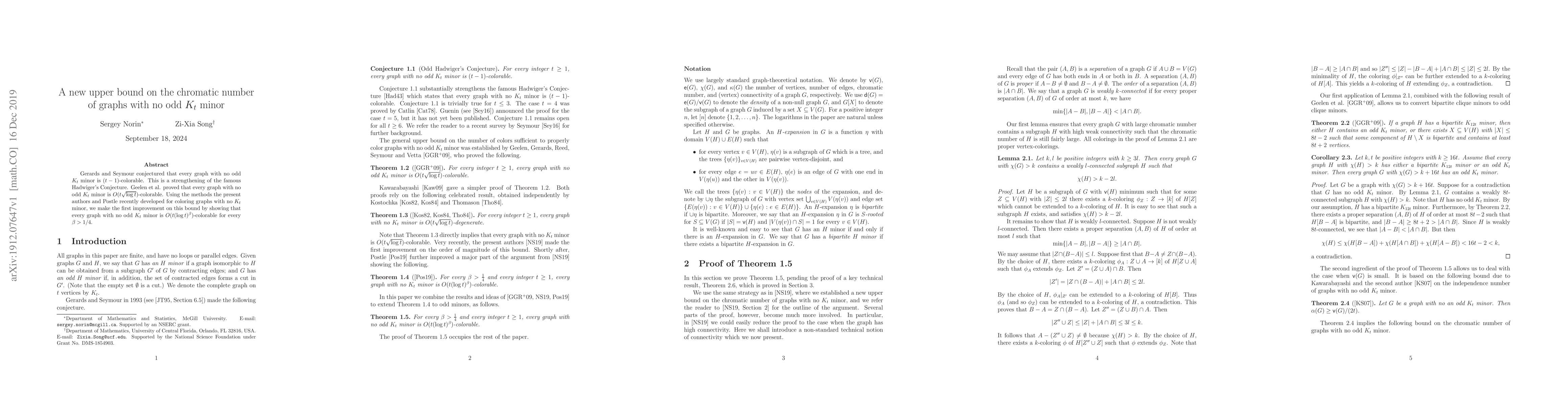 Researchers improved a previous bound on the colorability of graphs with no odd Kt minor, showing that such graphs can be colored with O(t(log t)^(1/4)) colors, strengthening a conjecture related to Hadwiger's Conjecture.