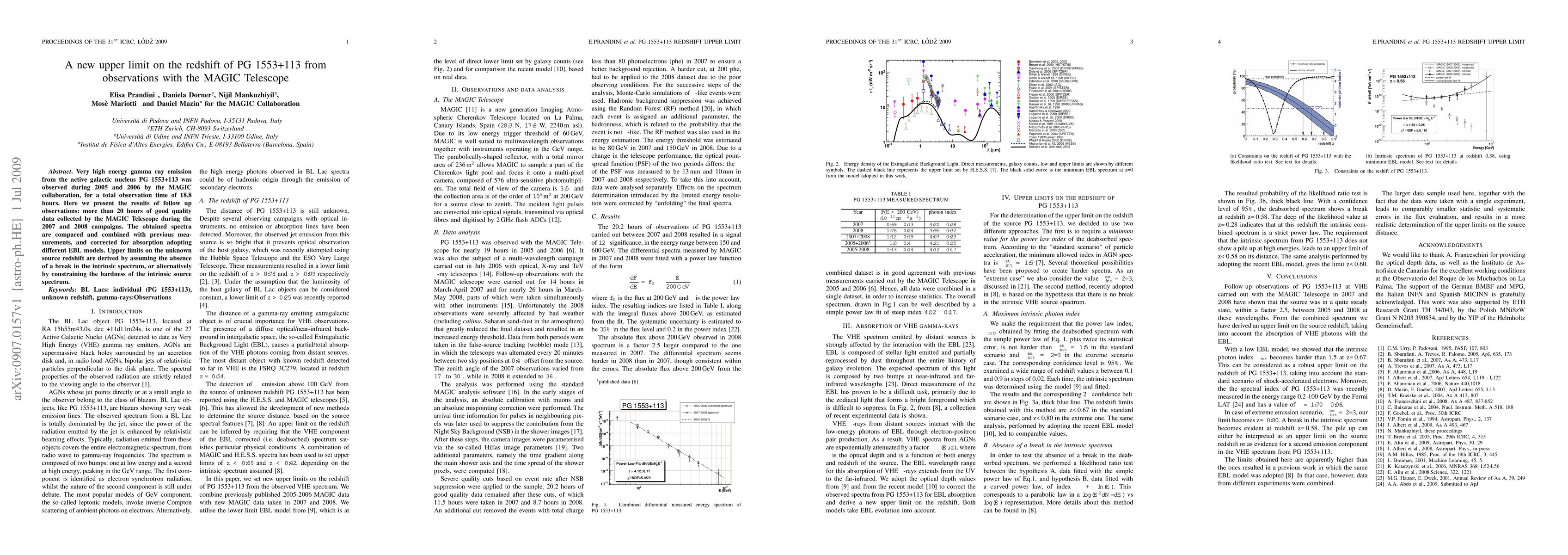 Very high energy gamma ray emission from the active galactic nucleus PG 1553+113 was observed during 2005 and 2006 by the MAGIC collaboration, for a total observation time of 18.8 hours. Here we present the results of follow up observations: more than 20 hours of good quality data collected by the MAGIC Telescope during the 2007 and 2008 campaigns. The obtained spectra are compared and combined with previous measurements, and corrected for absorption adopting different EBL models. Upper limits on the unknown source redshift are derived by assuming the absence of a break in the intrinsic spectrum, or alternatively by constraining the hardness of the intrinsic source spectrum.