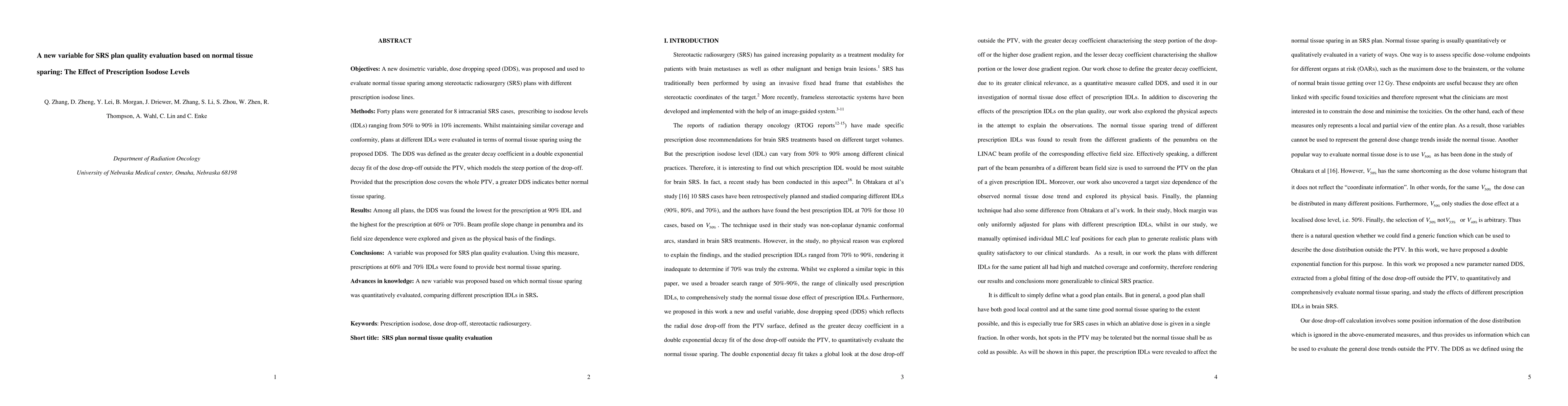 Objectives: A new dosimetric variable, dose dropping speed (DDS), was proposed and used to evaluate normal tissue sparing among stereotactic radiosurgery (SRS) plans with different prescription isodose lines. Methods: Forty plans were generated for 8 intracranial SRS cases, prescribing to isodose levels (IDLs) ranging from 50% to 90% in 10% increments. Whilst maintaining similar coverage and conformity, plans at different IDLs were evaluated in terms of normal tissue sparing using the proposed DDS. The DDS was defined as the greater decay coefficient in a double exponential decay fit of the dose drop-off outside the PTV, which models the steep portion of the drop-off. Provided that the prescription dose covers the whole PTV, a greater DDS indicates better normal tissue sparing. Results: Among all plans, the DDS was found the lowest for the prescription at 90% IDL and the highest for the prescription at 60% or 70%. Beam profile slope change in penumbra and its field size dependence were explored and given as the physical basis of the findings. Conclusions: A variable was proposed for SRS plan quality evaluation. Using this measure, prescriptions at 60% and 70% IDLs were found to provide best normal tissue sparing. Advances in knowledge: A new variable was proposed based on which normal tissue sparing was quantitatively evaluated, comparing different prescription IDLs in SRS.