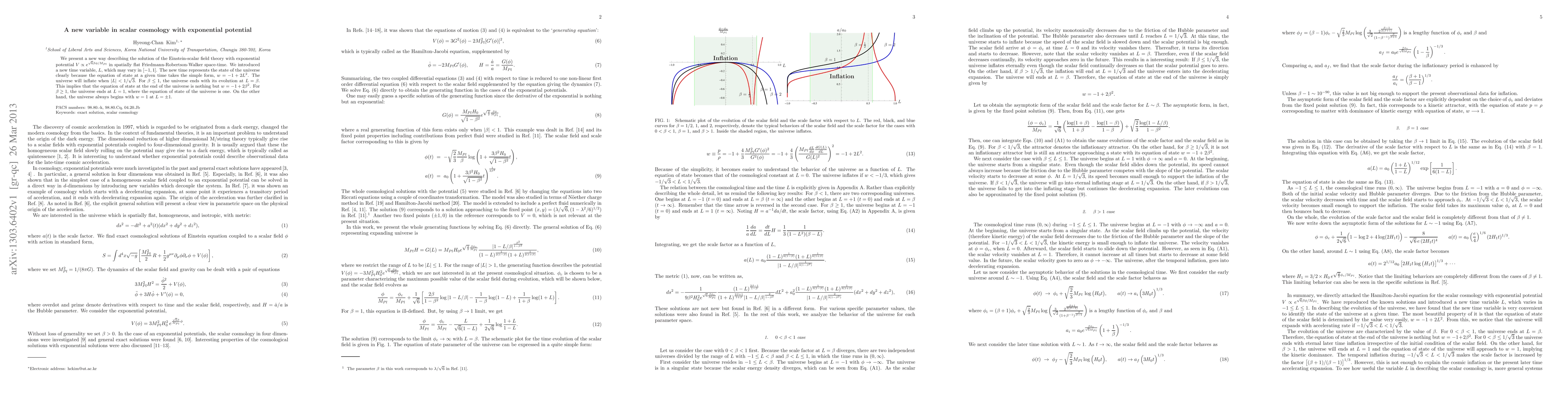 We present a new way describing the solution of the Einstein-scalar field theory with exponential potential $V\propto e^{\sqrt{6}\beta \phi/M_{Pl}}$ in spatially flat Friedmann-Robertson-Walker space-time. We introduced a new time variable, $L$, which may vary in $[-1,1]$. The new time represents the state of the universe clearly because the equation of state at a given time takes the simple form, $w= -1+ 2L^2$. The universe will inflate when $|L|<1/\sqrt{3}$. For $\beta\leq 1$, the universe ends with its evolution at $L=\beta$. This implies that the equation of state at the end of the universe is nothing but $w=-1+2\beta^2$. For $\beta \geq 1$, the universe ends at L=1, where the equation of state of the universe is one. On the other hand, the universe always begins with $w=1$ at $L=\pm 1$.