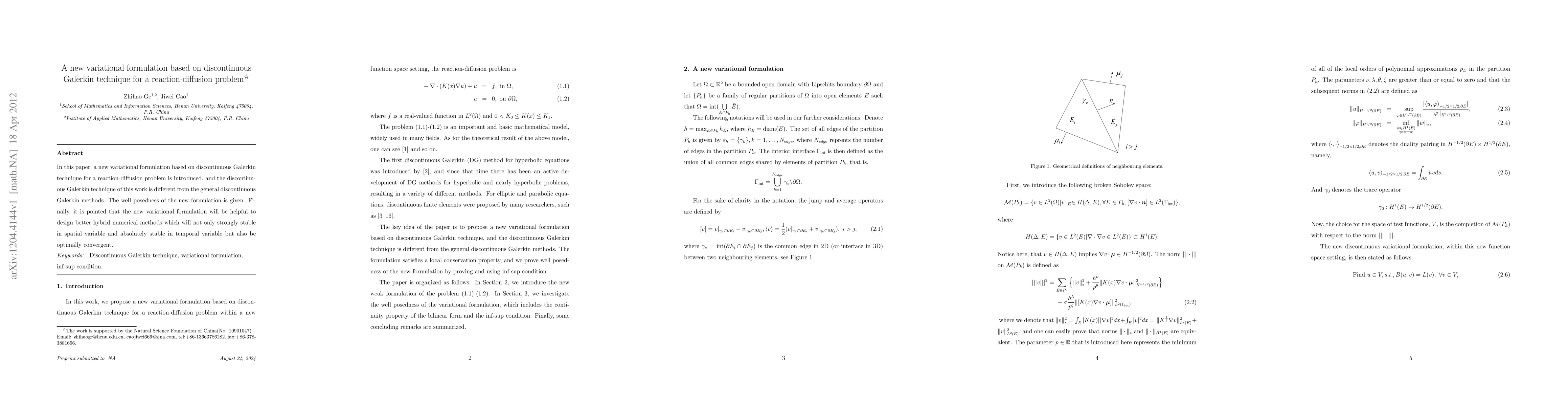 In this paper, a new variational formulation based on discontinuous Galerkin technique for a reaction-diffusion problem is introduced, and the discontinuous Galerkin technique of this work is different from the general discontinuous Galerkin methods. The well posedness of the new formulation is given. Finally, it is pointed that the new variational formulation will be helpful to design better hybrid numerical methods which will not only strongly stable in spatial variable and absolutely stable in temporal variable but also be optimally convergent.