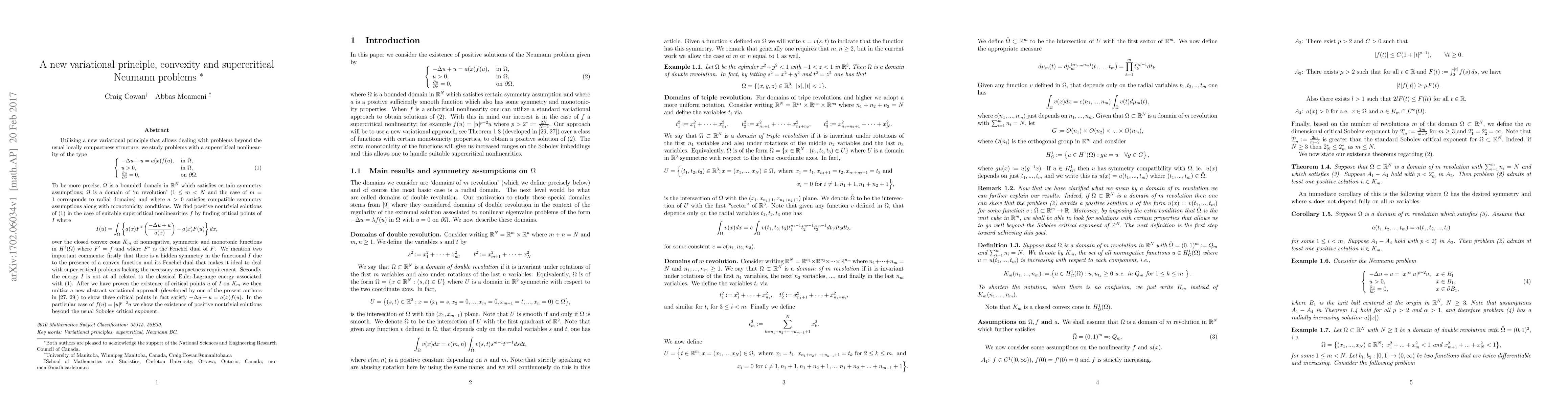 Utilizing a new variational principle that allows dealing with problems beyond the usual locally compactness structure, we study problems with a supercritical nonlinearity of the type $ -\Delta u + u= a(x) f(u)$ in $ \Omega$ with $\partial_\nu u=0$ on $ \partial \Omega$. Here $\Omega$ is a bounded domain with certain symmetry assumptions. We find positive nontrivial solutions in the case of suitable supercritical nonlinearities $f$ by finding critical points of $I$ where \[ I(u)=\int_\Omega \left\{ a(x) F^* \left( \frac{-\Delta u + u}{a(x)} \right) - a(x) F(u) \right\} dx, \] over the closed convex cone $K_m$ of nonnegative, symmetric and monotonic functions in $H^1(\Omega)$ where $F'=f$ and where $ F^*$ is the Fenchel dual of $F$. We mention two important comments: firstly that there is a hidden symmetry in the functional $I$ due to the presence of a convex function and its Fenchel dual that makes it ideal to deal with super-critical problems lacking the necessary compactness requirement. Secondly the energy $I$ is not at all related to the classical Euler-Lagrange energy associated with equation. After we have proven the existence of critical points $u$ of $I$ on $K_m$ we then unitize a new abstract variational approach (developed by one of the present authors in \cite{Mo,Mo2}) to show these critical points in fact satisfy $-\Delta u + u = a(x) f(u)$. In the particular case of $ f(u)=|u|^{p-2} u$ we show the existence of positive nontrivial solutions beyond the usual Sobolev critical exponent.