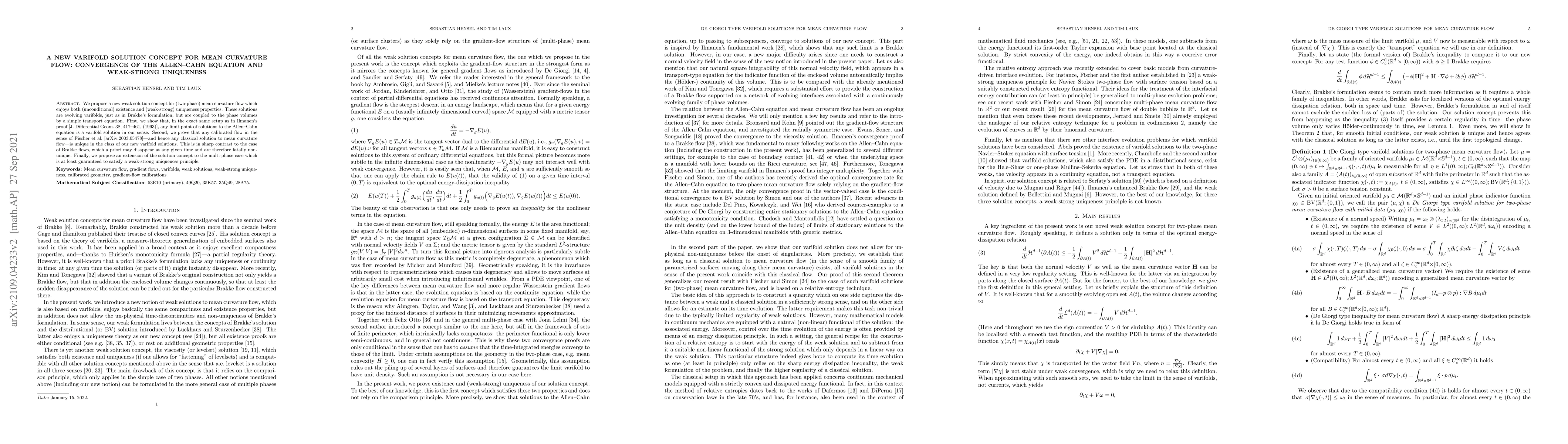 We propose a new weak solution concept for (two-phase) mean curvature flow which enjoys both (unconditional) existence and (weak-strong) uniqueness properties. These solutions are evolving varifolds, just as in Brakke's formulation, but are coupled to the phase volumes by a simple transport equation. First, we show that, in the exact same setup as in Ilmanen's proof [J. Differential Geom. 38, 417-461, (1993)], any limit point of solutions to the Allen-Cahn equation is a varifold solution in our sense. Second, we prove that any calibrated flow in the sense of Fischer et al. [arXiv:2003.05478] - and hence any classical solution to mean curvature flow - is unique in the class of our new varifold solutions. This is in sharp contrast to the case of Brakke flows, which a priori may disappear at any given time and are therefore fatally non-unique. Finally, we propose an extension of the solution concept to the multi-phase case which is at least guaranteed to satisfy a weak-strong uniqueness principle.