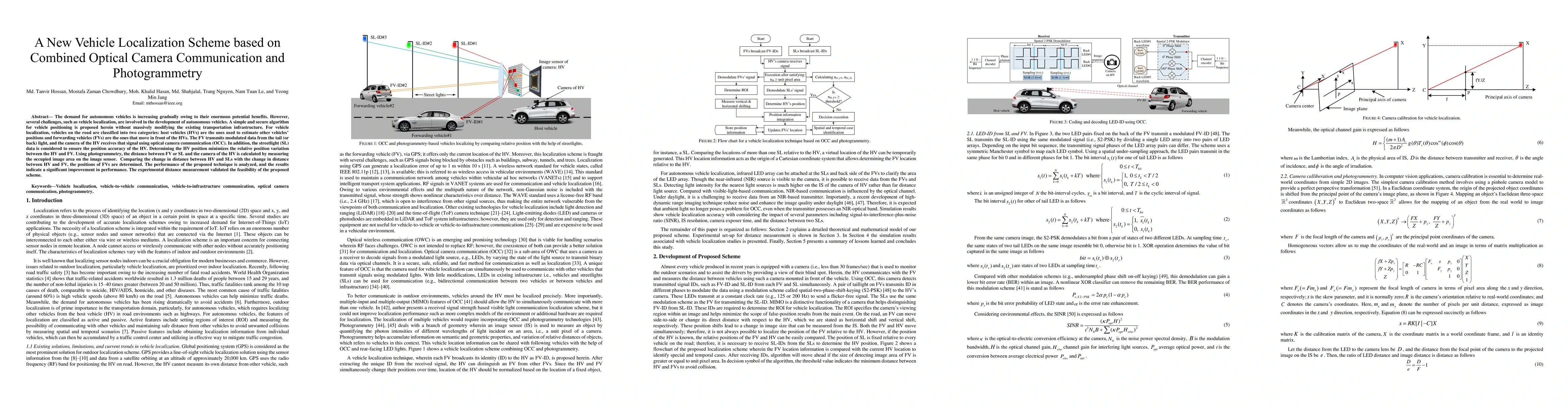 A new vehicle localization scheme uses combined optical camera communication and photogrammetry to accurately position autonomous vehicles without modifying infrastructure. The method shows significant improvement in performance through experimental distance measurement validation.