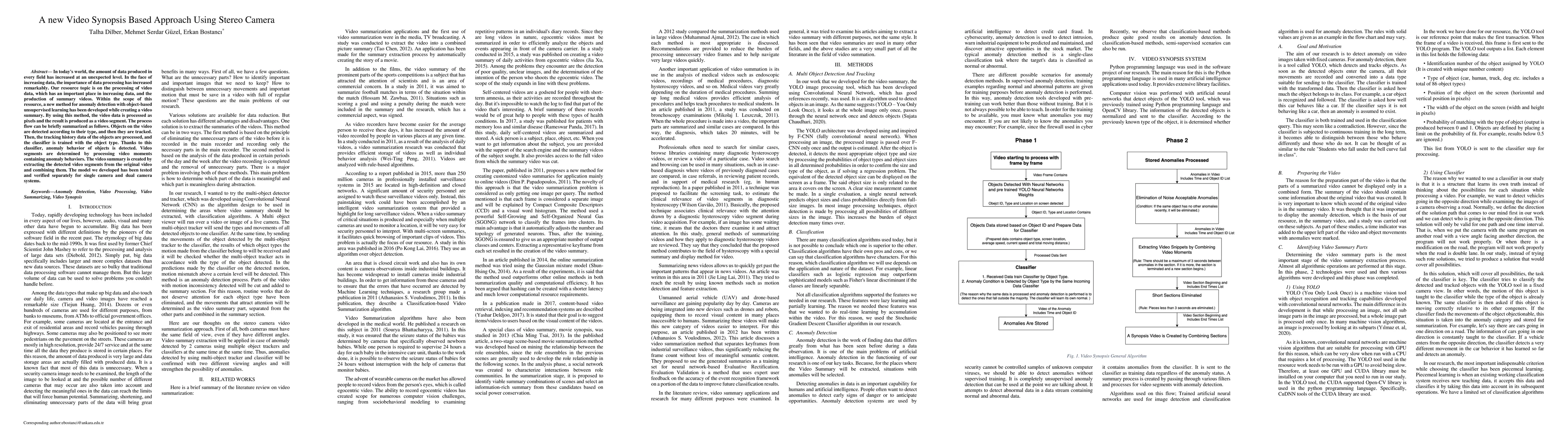 In today's world, the amount of data produced in every field has increased at an unexpected level. In the face of increasing data, the importance of data processing has increased remarkably. Our resource topic is on the processing of video data, which has an important place in increasing data, and the production of summary videos. Within the scope of this resource, a new method for anomaly detection with object-based unsupervised learning has been developed while creating a video summary. By using this method, the video data is processed as pixels and the result is produced as a video segment. The process flow can be briefly summarized as follows. Objects on the video are detected according to their type, and then they are tracked. Then, the tracking history data of the objects are processed, and the classifier is trained with the object type. Thanks to this classifier, anomaly behavior of objects is detected. Video segments are determined by processing video moments containing anomaly behaviors. The video summary is created by extracting the detected video segments from the original video and combining them. The model we developed has been tested and verified separately for single camera and dual camera systems.