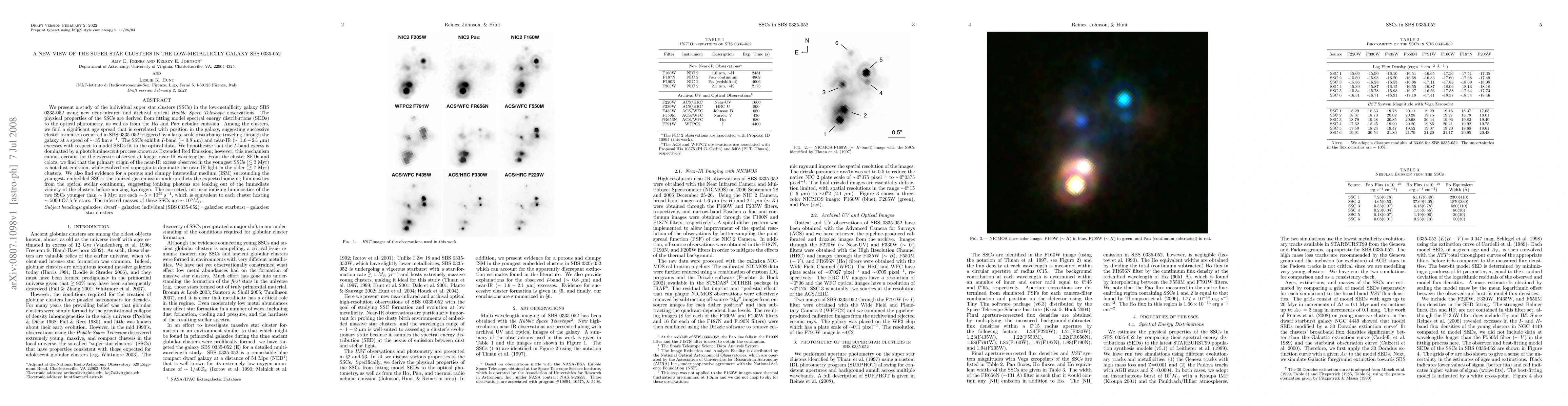 The study of SBS 0335-052 reveals a significant age spread in its super star clusters (SSCs), indicating successive formation triggered by a galactic disturbance. Younger clusters (<3 Myr) show hot dust emission in near-IR, while older (>7 Myr) ones are dominated by red supergiants. Youngest SSCs exhibit ionizing photon leakage, inferred to be equivalent to ~5000 O7.5 V stars each, with masses ~10^6 M_sun.