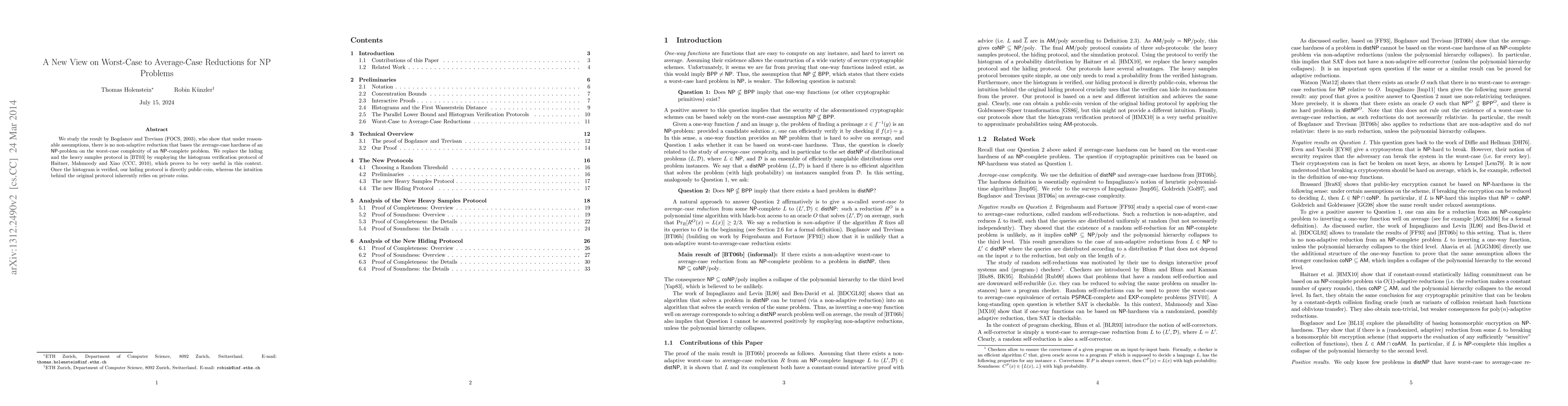 This paper proposes a new method for worst-case to average-case reductions in NP problems, replacing the original protocol by using the histogram verification protocol. This approach allows for a public-coin hiding protocol, contrasting with the private coin reliance of the original method.