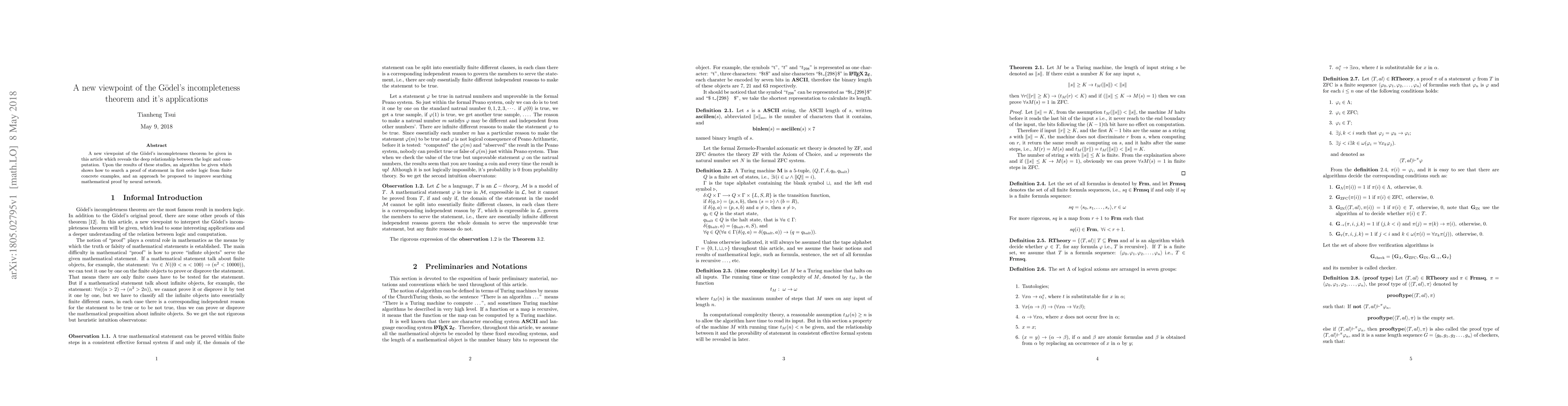 A new viewpoint of the G\"odel's incompleteness theorem be given in this article which reveals the deep relationship between the logic and computation. Upon the results of these studies, an algorithm be given which shows how to search a proof of statement in first order logic from finite concrete examples, and an approach be proposed to improve searching mathematical proof by neural network.