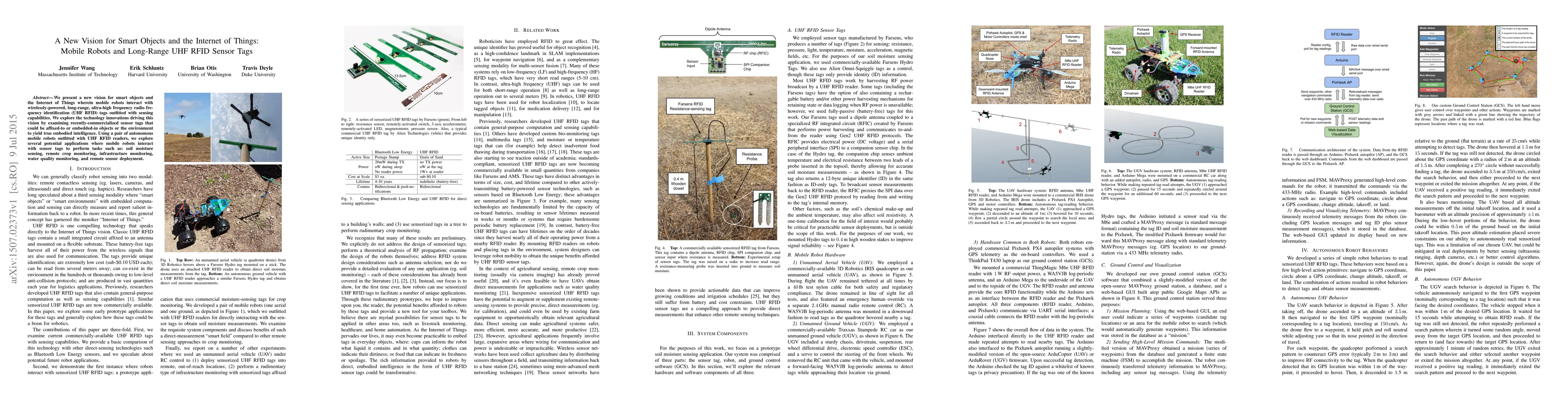 This paper proposes a new vision for smart objects and the Internet of Things, featuring mobile robots interacting with long-range UHF RFID sensor tags for tasks like soil moisture sensing and remote crop monitoring. The study explores the potential applications of these technologies in infrastructure and water quality monitoring.