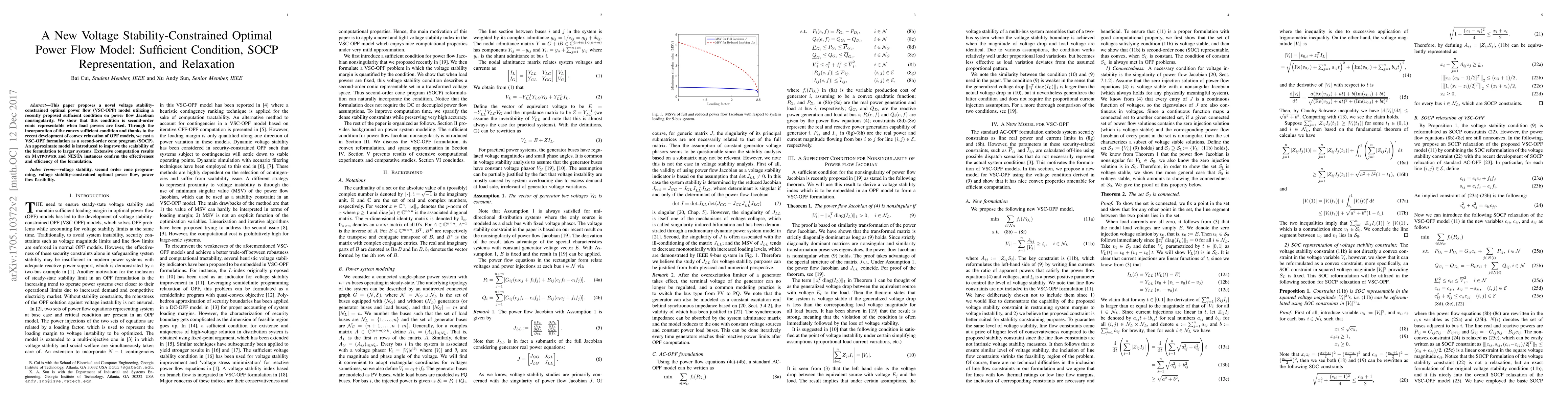 A simple characterization of the solvability of power flow equations is of great importance in the monitoring, control, and protection of power systems. In this paper, we introduce a sufficient condition for power flow Jacobian nonsingularity. We show that this condition is second-order conic representable when load powers are fixed. Through the incorporation of the sufficient condition, we propose a voltage stability-constrained optimal power flow (VSC-OPF) formulation as a second-order cone program (SOCP). An approximate model is introduced to improve the scalability of the formulation to larger systems. Extensive computation results on Matpower and NESTA instances confirm the effectiveness and efficiency of the formulation.