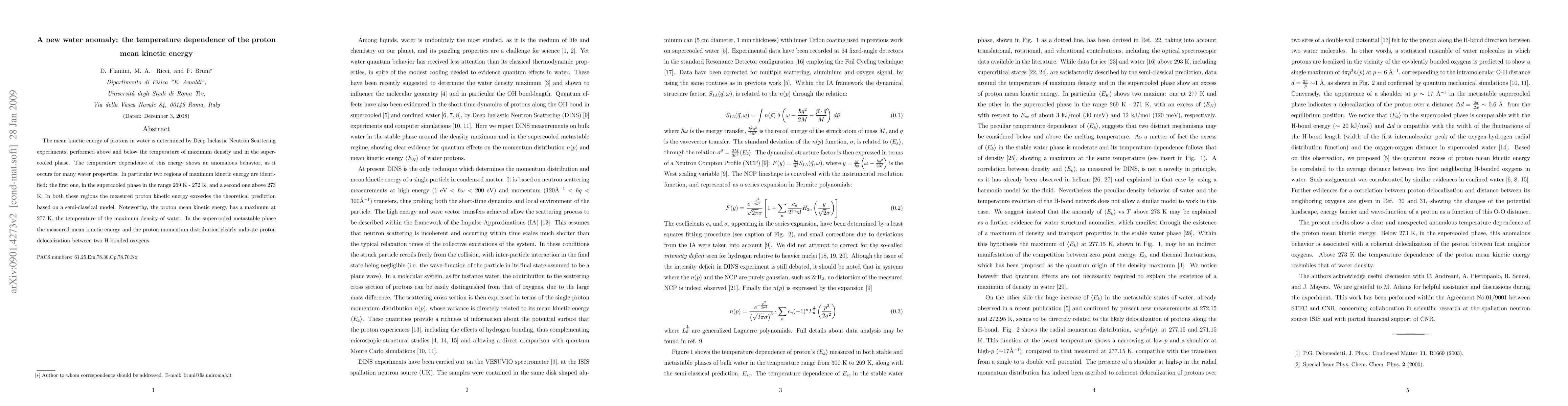 This study reveals an anomalous temperature dependence of proton mean kinetic energy in water, identified through Deep Inelastic Neutron Scattering experiments. Two regions of maximum kinetic energy are found, one in the supercooled phase and another above 273 K, both exceeding semi-classical predictions, with a peak at 277 K, the temperature of maximum density.
