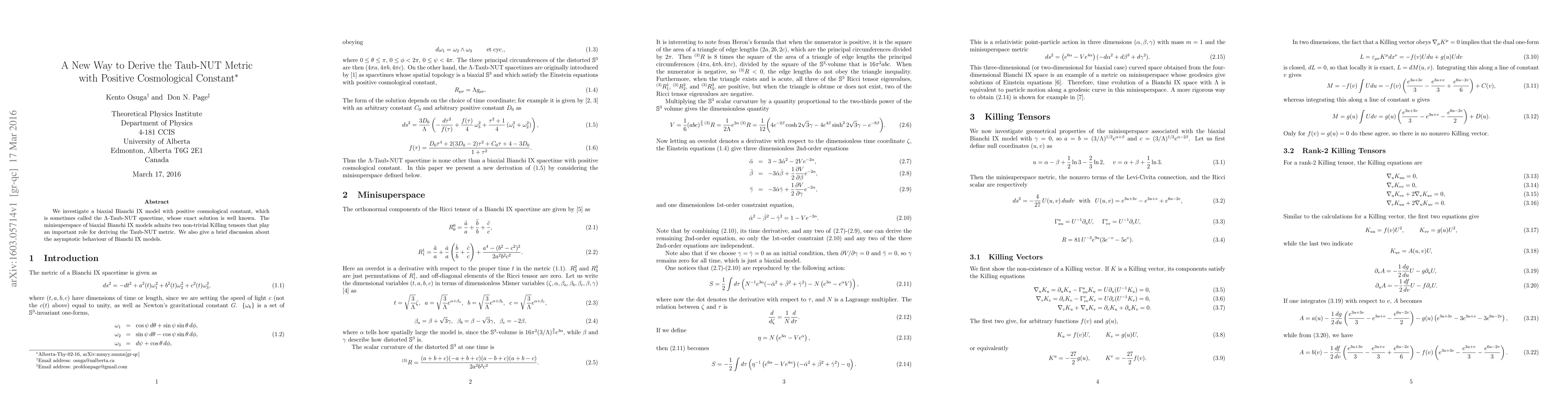 This paper derives the Taub-NUT metric with a positive cosmological constant using a biaxial Bianchi IX model, highlighting the significance of two non-trivial Killing tensors in the process. It also briefly discusses the asymptotic behavior of Bianchi IX models.