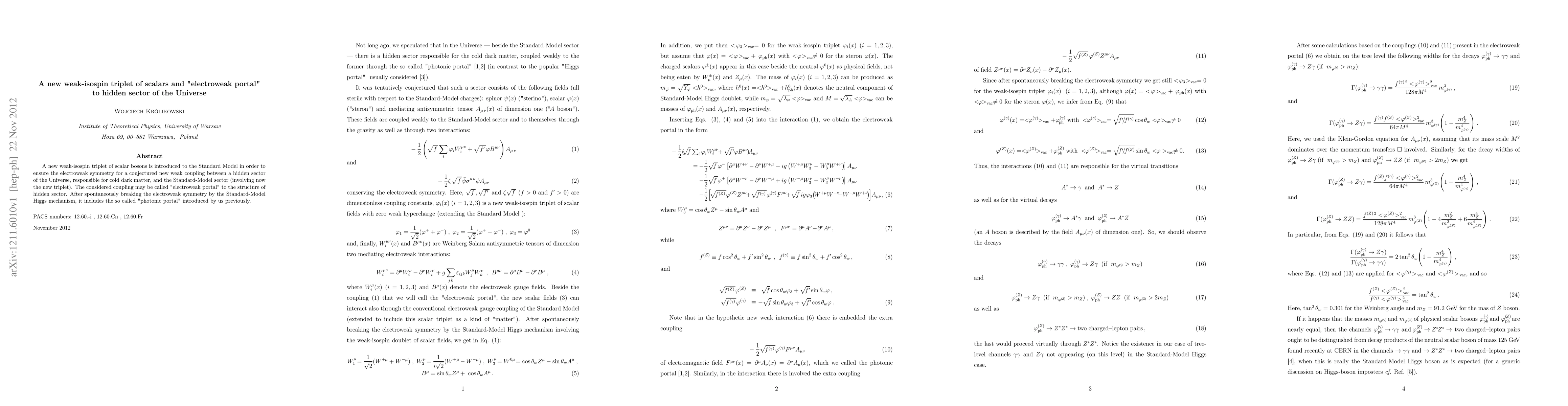This paper proposes a new weak-isospin triplet of scalar bosons to extend the Standard Model, introducing a "electroweak portal" for a new weak coupling between the Standard Model and a hidden sector of the Universe, potentially explaining cold dark matter. The model includes a "photonic portal" after electroweak symmetry breaking.