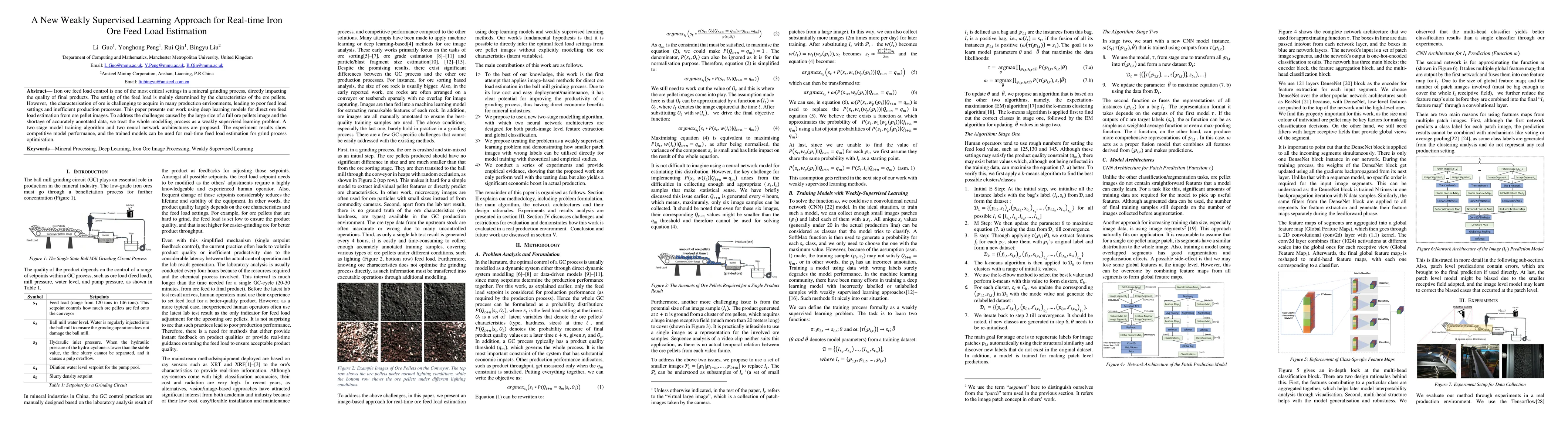 This paper proposes a weakly supervised deep learning approach for real-time iron ore feed load estimation using ore pellet images, addressing the challenges of large image sizes and limited annotated data. The method employs two-stage model training and neural network architectures, demonstrating competitive performance for optimizing mineral grinding processes.