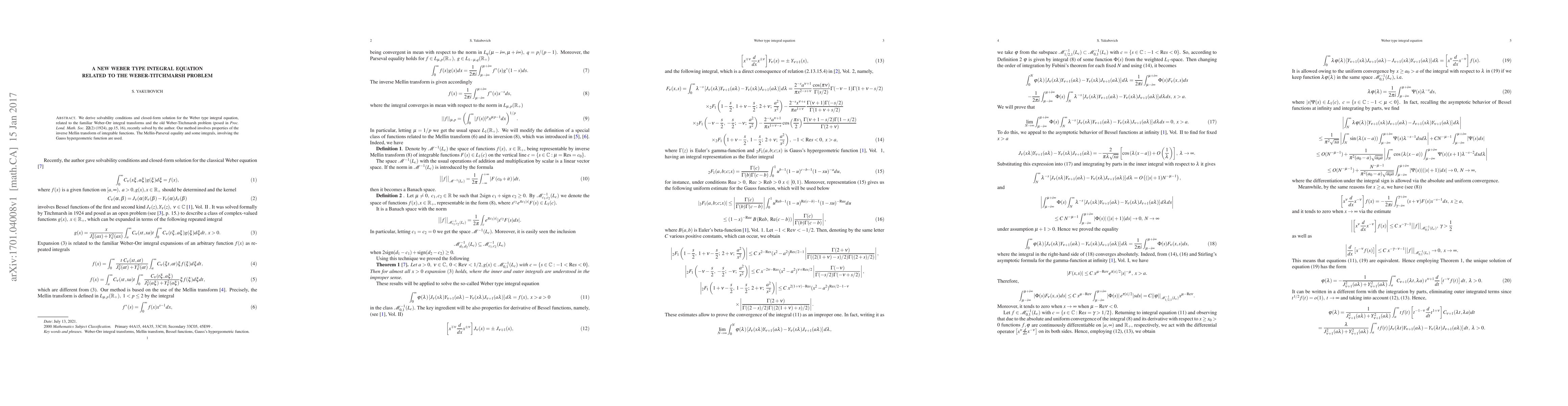 This paper derives solvability conditions and a closed-form solution for a Weber type integral equation connected to the Weber-Titchmarsh problem, employing the inverse Mellin transform and Gauss hypergeometric functions. The methodology leverages the Mellin-Parseval equality and specific integral calculations.