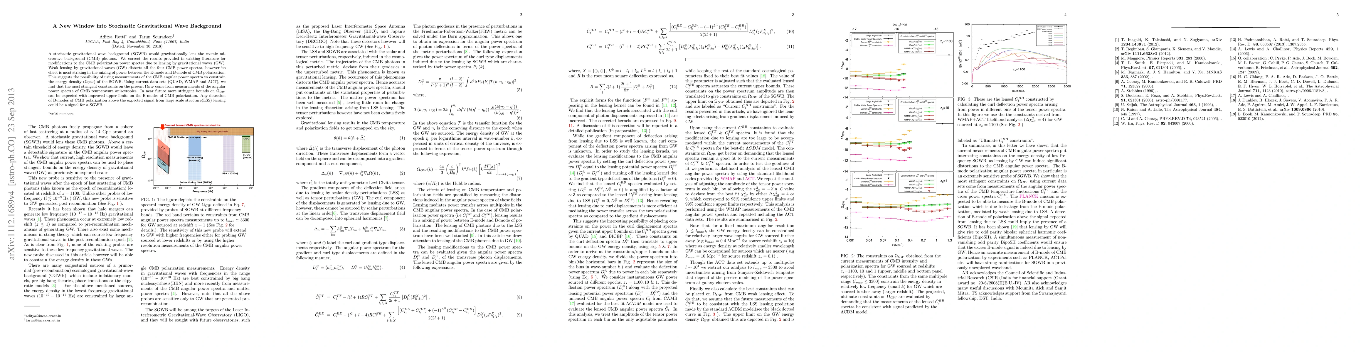 A stochastic gravitational wave background (SGWB) would gravitationally lens the cosmic microwave background (CMB) photons. We find that the lensing due to gravitational waves(GW) is more efficient as compared to lensing due to scalar density perturbations. Though the effect of lensing due to GW is found to effect all the four CMB power spectra, its effect is most prominently seen in the CMB polarization power spectra. This suggests that the measurements of the CMB angular power spectra could be used to constraining the energy density ($\Omega_{GW}$) of the SGBW. In our analysis we find that the most stringent constraints on $\Omega_{GW}$ are due to measurements of the angular power spectra of CMB temperature anisotropies. We show that in the future it will be possible to place more stringent bounds on $\Omega_{GW}$ using improved upper limits or detections of the angular power spectra of the B-modes of CMB polarization at large multipoles.