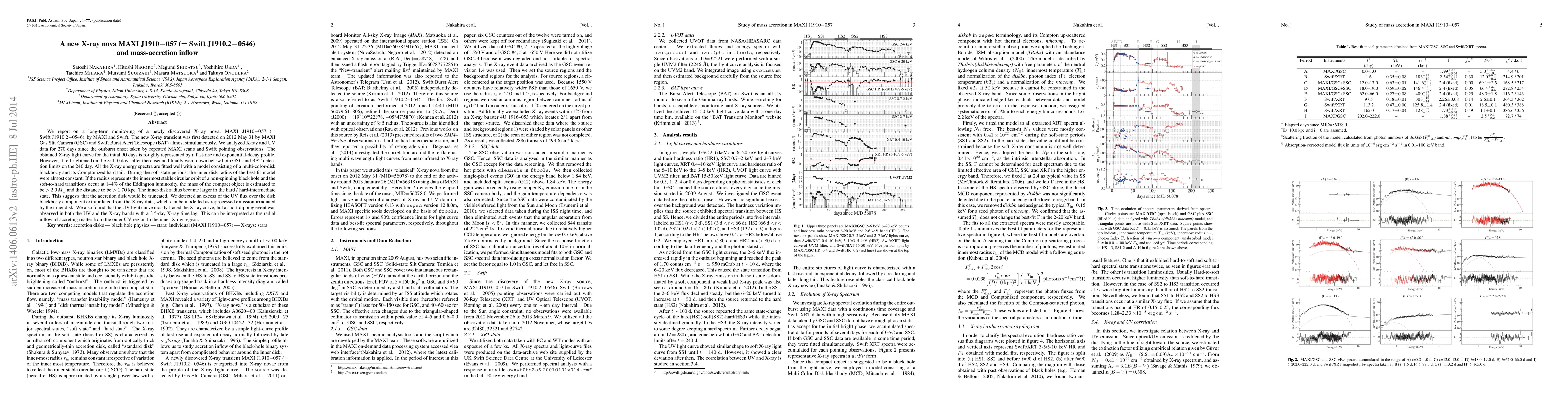 The research paper presents a 270-day monitoring of the X-ray nova MAXI J1910-057. Key findings include a fast-rise, exponential-decay X-ray light curve with a re-brightening phase, and spectral analysis indicating a non-spinning black hole with mass >2.9 times that of the Sun and a distance >1.70 kpc. The study also reveals a UV flux excess suggesting inner disk irradiation and a short X-ray lag in UV dips, indicating radial inflow of accreting matter.