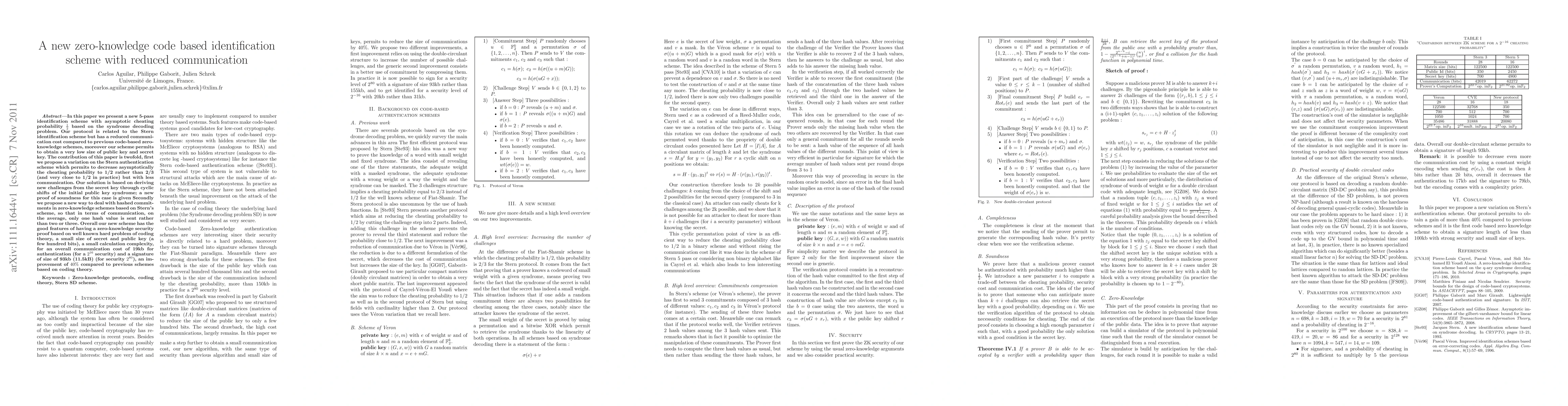 A new zero-knowledge identification scheme with reduced communication is presented, achieving asymptotic cheating probability 1/2 with minimal public key size, compared to previous schemes.