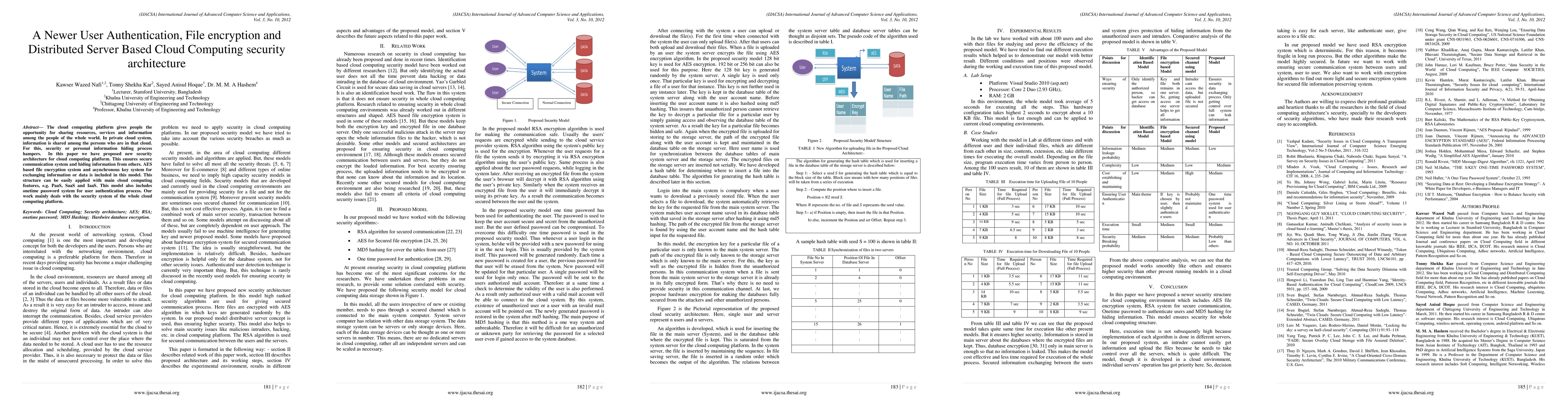 This paper proposes a new security architecture for cloud computing that includes AES-based file encryption, an asynchronous key exchange system, and a one-time password user authentication method to ensure secure communication and information privacy in private cloud systems. The model is compatible with major cloud services like PaaS, SaaS, and IaaS.