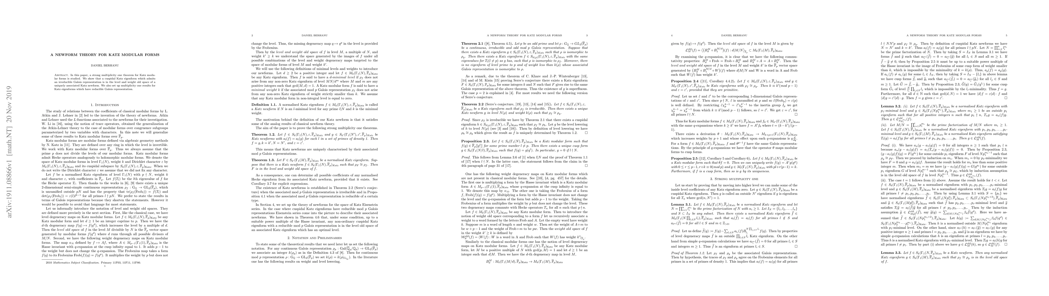 A newform theory for Katz modular forms is established, showing that cuspidal Katz eigenforms with irreducible Galois representations are associated with unique Katz newforms, providing a strong multiplicity one theorem.