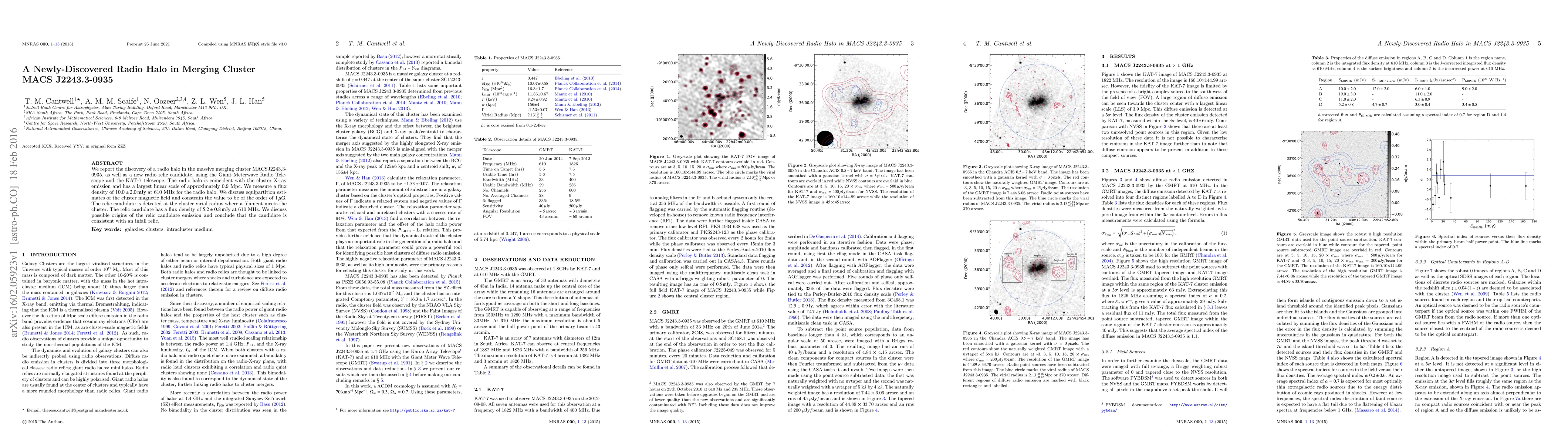 We report the discovery of a radio halo in the massive merging cluster MACSJ2243.3-0935, as well as a new radio relic candidate, using the Giant Meterwave Radio Telescope and the KAT-7 telescope. The radio halo is coincident with the cluster X-ray emission and has a largest linear scale of approximately 0.9 Mpc. We measure a flux density of $10.0\pm 2.0$ mJy at 610 MHz for the radio halo. We discuss equipartition estimates of the cluster magnetic field and constrain the value to be of the order of 1 $\mu$G. The relic candidate is detected at the cluster virial radius where a filament meets the cluster. The relic candidate has a flux density of $5.2\pm 0.8$ mJy at 610 MHz. We discuss possible origins of the relic candidate emission and conclude that the candidate is consistent with an infall relic.