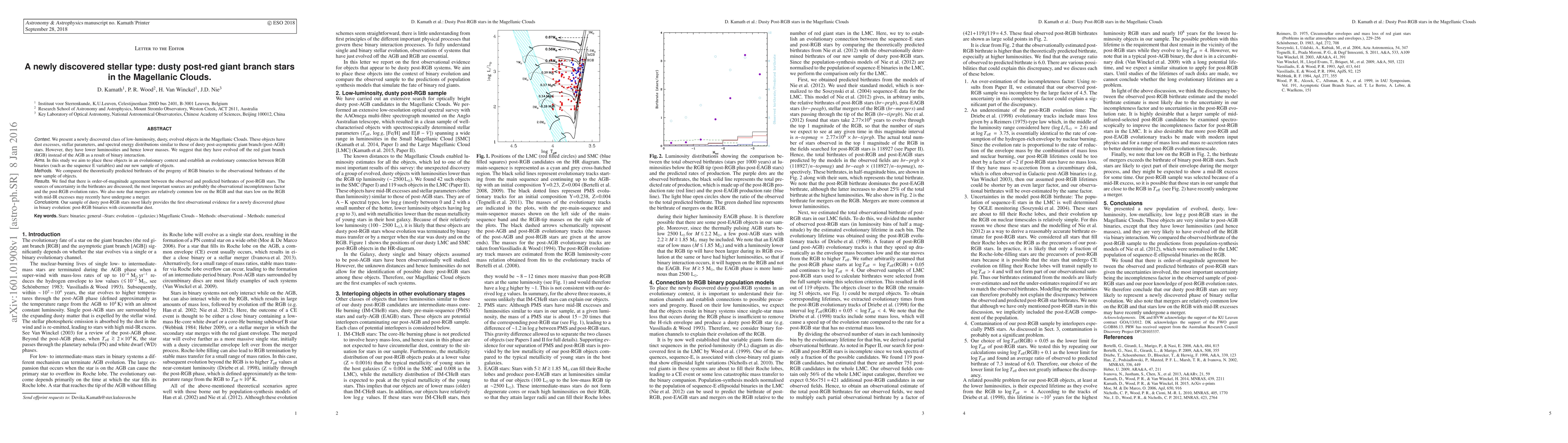 Context: We present a newly discovered class of low-luminosity, dusty, evolved objects in the Magellanic Clouds. These objects have dust excesses, stellar parameters, and spectral energy distributions similar to those of dusty post-asymptotic giant branch (post-AGB) stars. However, they have lower luminosities and hence lower masses. We suggest that they have evolved off the red giant branch (RGB) instead of the AGB as a result of binary interaction. Aims: In this study we aim to place these objects in an evolutionary context and establish an evolutionary connection between RGB binaries (such as the sequence E variables) and our new sample of objects. Methods: We compared the theoretically predicted birthrates of the progeny of RGB binaries to the observational birthrates of the new sample of objects. Results: We find that there is order-of-magnitude agreement between the observed and predicted birthrates of post-RGB stars. The sources of uncertainty in the birthrates are discussed; the most important sources are probably the observational incompleteness factor and the post-RGB evolution rates. We also note that mergers are relatively common low on the RGB and that stars low on the RGB with mid-IR excesses may recently have undergone a merger. Conclusions: Our sample of dusty post-RGB stars most likely provides the first observational evidence for a newly discovered phase in binary evolution: post-RGB binaries with circumstellar dust.