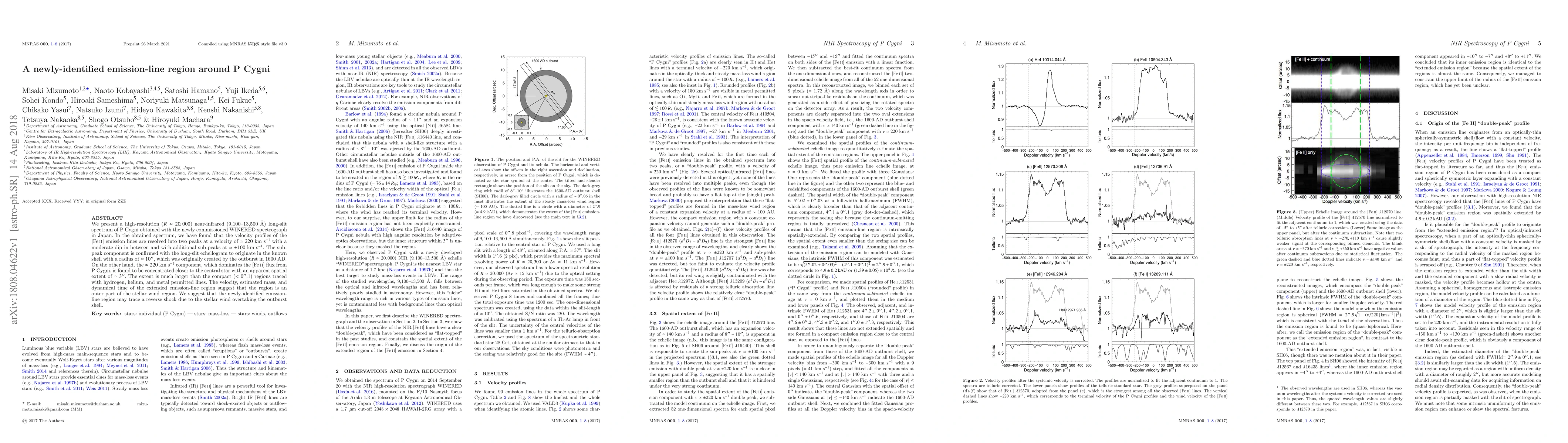 We present a high-resolution ($R \simeq 20,000$) near-infrared (9,100-13,500 $\AA$) long-slit spectrum of P Cygni obtained with the newly commissioned WINERED spectrograph in Japan. In the obtained spectrum, we have found that the velocity profiles of the [Fe II] emission lines are resolved into two peaks at a velocity of $\simeq220$ km s$^{-1}$ with a moderate dip in between and with additional sub-peaks at $\simeq\pm100$~km~s$^{-1}$. The sub-peak component is confirmed with the long-slit echellogram to originate in the known shell with a radius of $\simeq10^{\prime\prime}$, which was originally created by the outburst in 1600 AD. On the other hand, the $\simeq220$ km s$^{-1}$ component, which dominates the [Fe II] flux from P Cygni, is found to be concentrated closer to the central star with an apparent spatial extent of $\simeq3^{\prime\prime}$. The extent is much larger than the compact ($<0^{\prime\prime}.1$) regions traced with hydrogen, helium, and metal permitted lines. The velocity, estimated mass, and dynamical time of the extended emission-line region suggest that the region is an outer part of the stellar wind region. We suggest that the newly-identified emission-line region may trace a reverse shock due to the stellar wind overtaking the outburst shell.