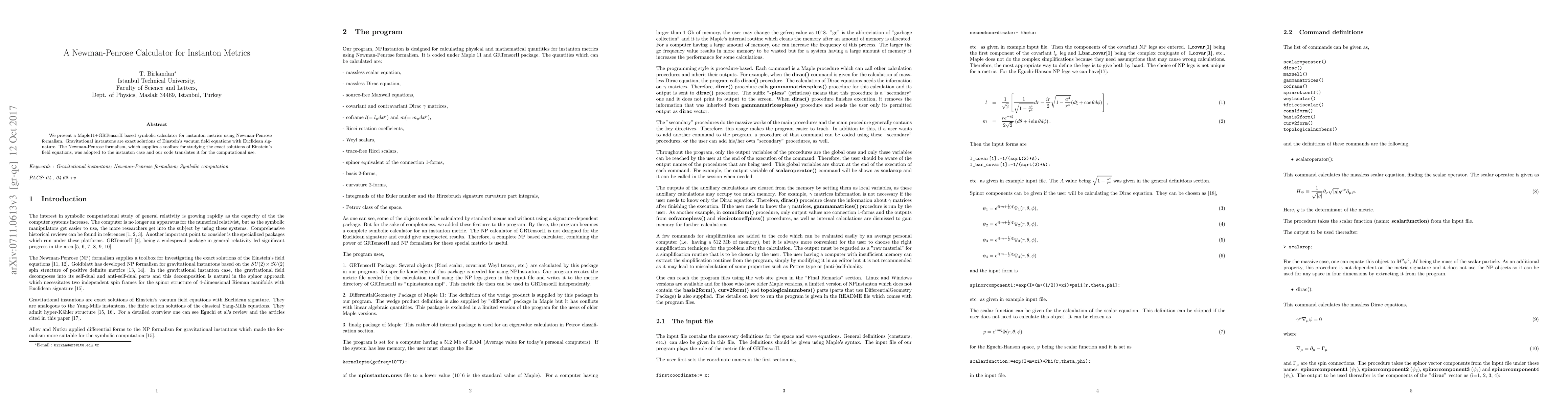 We present a Maple11+GRTensorII based symbolic calculator for instanton metrics using Newman-Penrose formalism. Gravitational instantons are exact solutions of Einstein's vacuum field equations with Euclidean signature. The Newman-Penrose formalism, which supplies a toolbox for studying the exact solutions of Einstein's field equations, was adopted to the instanton case and our code translates it for the computational use.