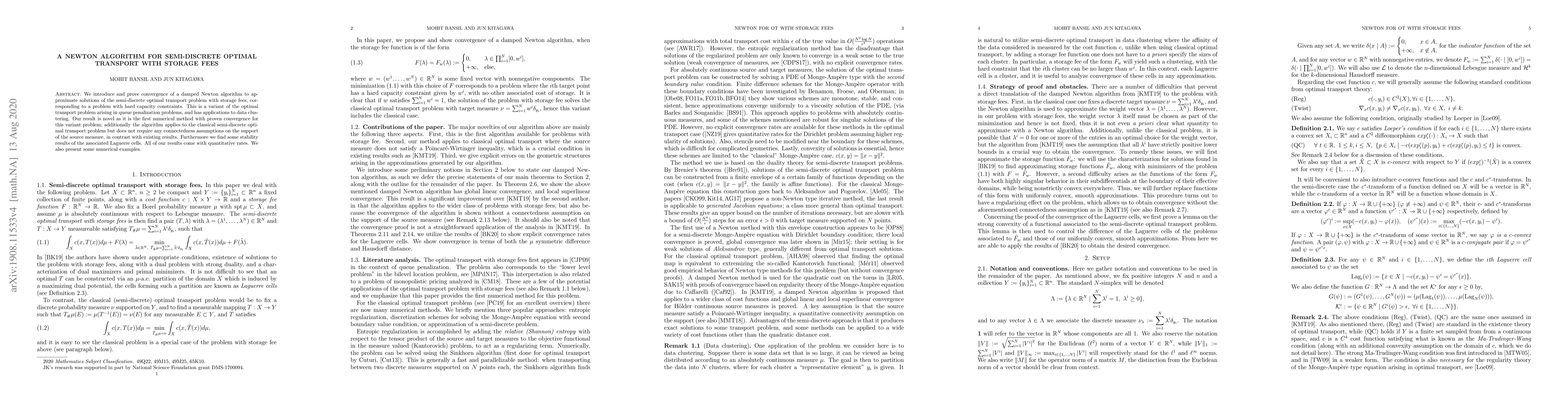 This paper presents a novel damped Newton algorithm for solving the semi-discrete optimal transport problem with storage fees, proving its convergence and stability. Unlike existing methods, it does not require the source measure's support to be connected, and provides quantitative rates for its performance.