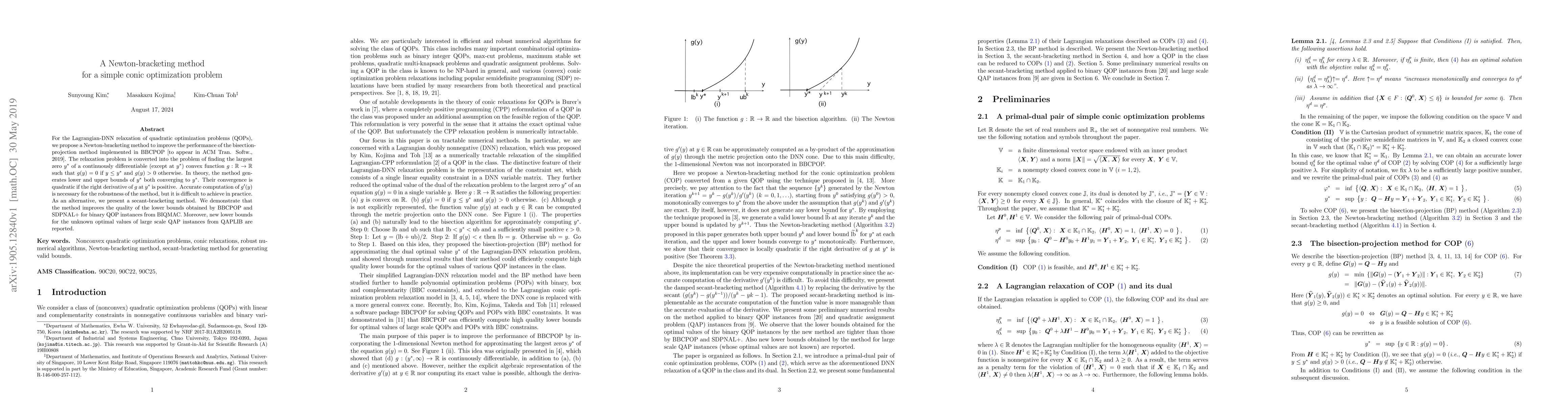 For the Lagrangian-DNN relaxation of quadratic optimization problems (QOPs), we propose a Newton-bracketing method to improve the performance of the bisection-projection method implemented in BBCPOP [to appear in ACM Tran. Softw., 2019]. The relaxation problem is converted into the problem of finding the largest zero $y^*$ of a continuously differentiable (except at $y^*$) convex function $g : \mathbb{R} \rightarrow \mathbb{R}$ such that $g(y) = 0$ if $y \leq y^*$ and $g(y) > 0$ otherwise. In theory, the method generates lower and upper bounds of $y^*$ both converging to $y^*$. Their convergence is quadratic if the right derivative of $g$ at $y^*$ is positive. Accurate computation of $g'(y)$ is necessary for the robustness of the method, but it is difficult to achieve in practice. As an alternative, we present a secant-bracketing method. We demonstrate that the method improves the quality of the lower bounds obtained by BBCPOP and SDPNAL+ for binary QOP instances from BIQMAC. Moreover, new lower bounds for the unknown optimal values of large scale QAP instances from QAPLIB are reported.