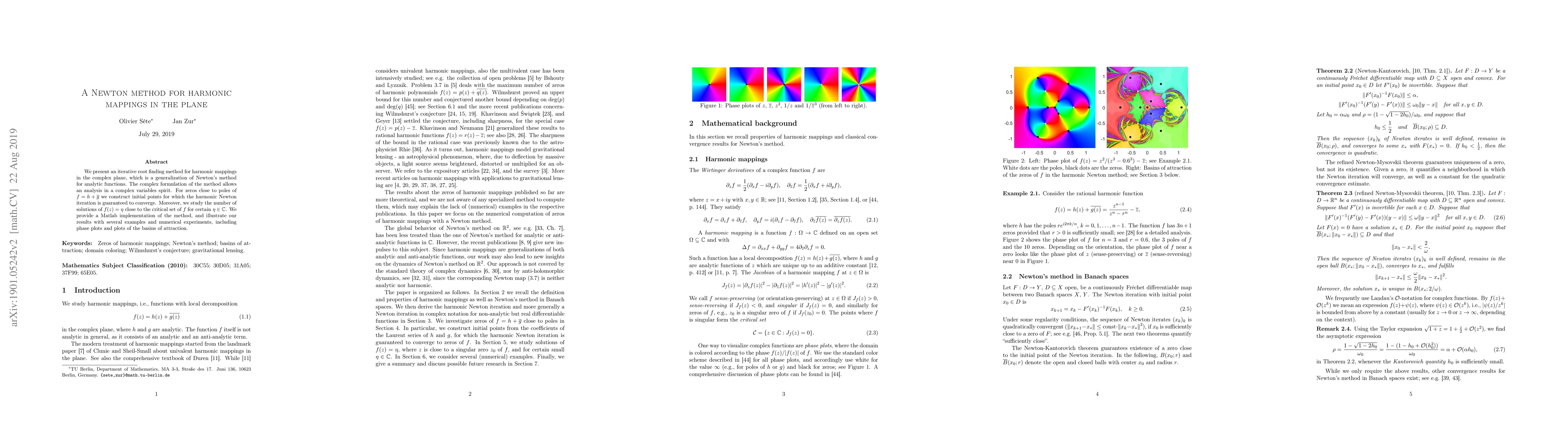 This paper introduces a Newton method for finding roots of harmonic mappings in the complex plane, extending traditional Newton's method for analytic functions. It also constructs initial points ensuring convergence near poles and studies solution distributions near critical points, providing a Matlab implementation and numerical examples.