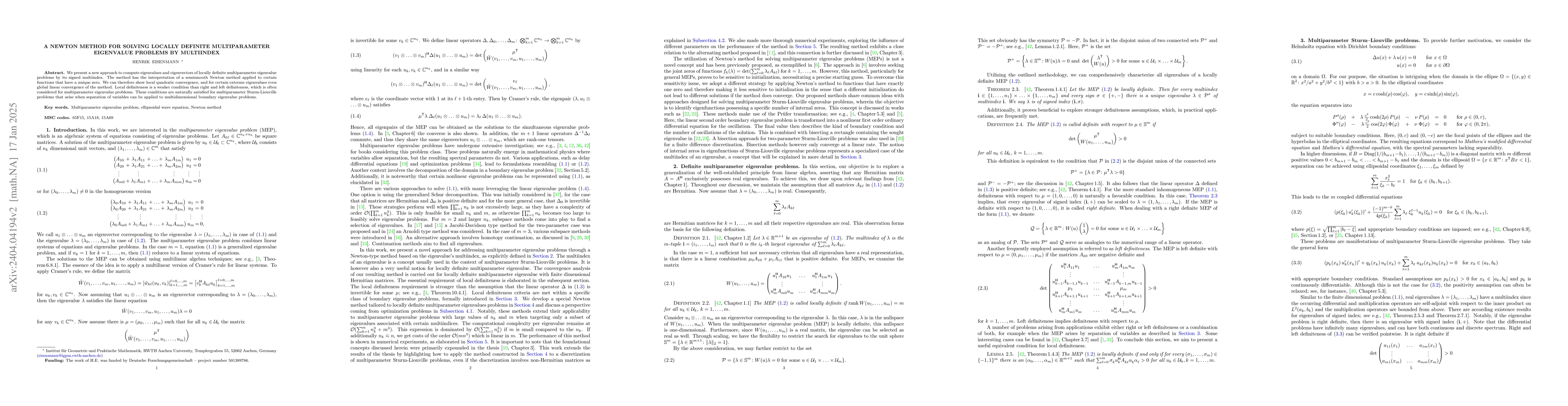 This paper introduces a Newton method for solving multiparameter eigenvalue problems, showing local quadratic convergence and, for extreme eigenvalues, global linear convergence. It leverages the concept of local definiteness, which is a weaker condition than right and left definiteness, and applies to multiparameter Sturm-Liouville problems.