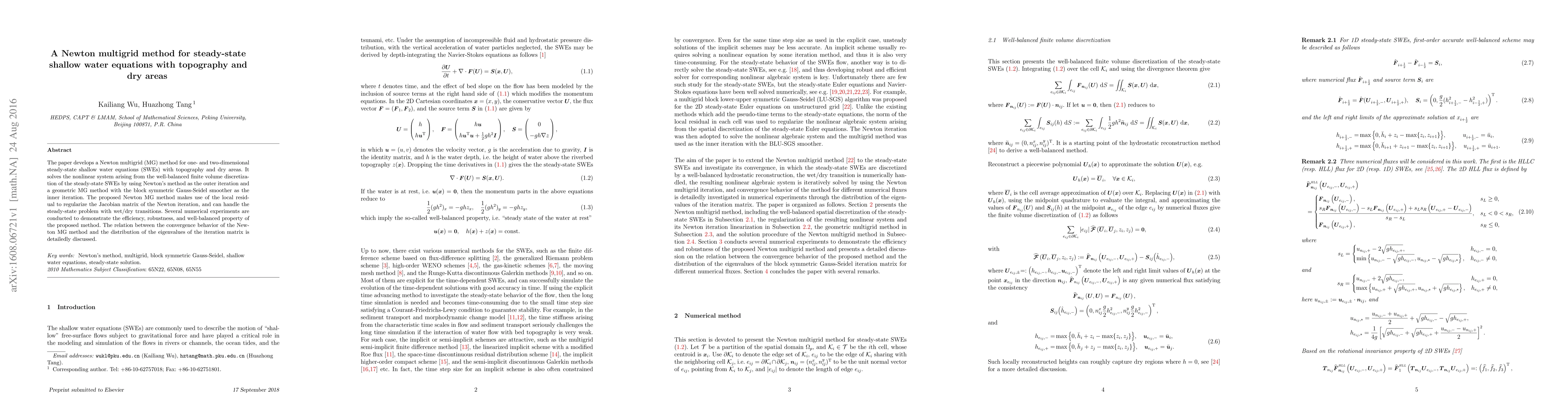 The paper proposes a Newton multigrid method for solving steady-state shallow water equations with topography and dry areas, utilizing Newton's method and a geometric multigrid approach with a block symmetric Gauss-Seidel smoother. Numerical experiments show the method's efficiency and robustness in handling wet/dry transitions.