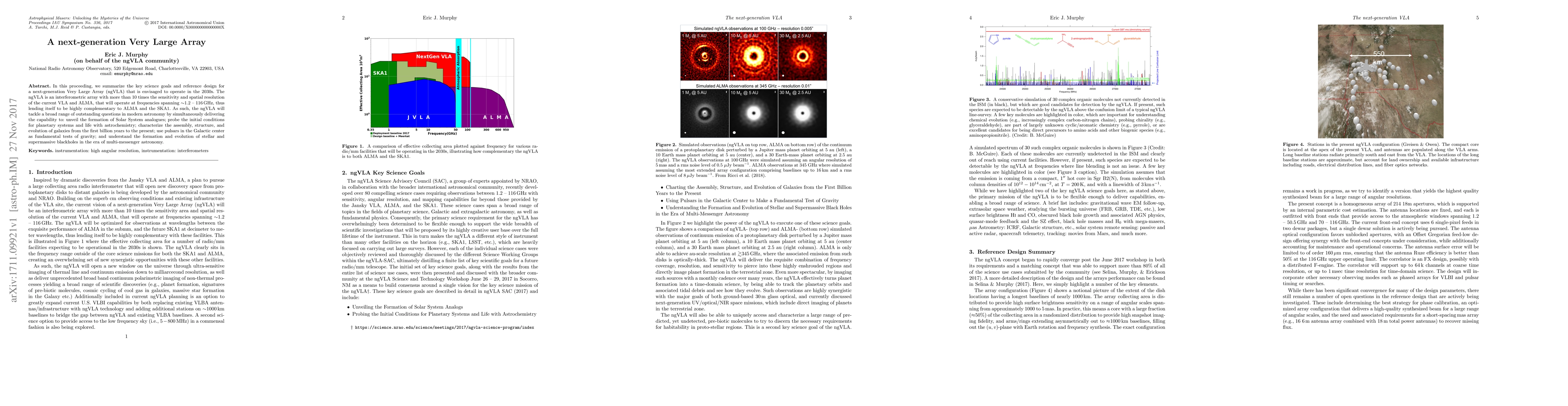 The next-generation Very Large Array (ngVLA) aims to provide over ten times the sensitivity and resolution of current arrays, operating from 1.2 to 116 GHz to address key questions in modern astronomy, including solar system formation, galaxy evolution, and black hole dynamics.