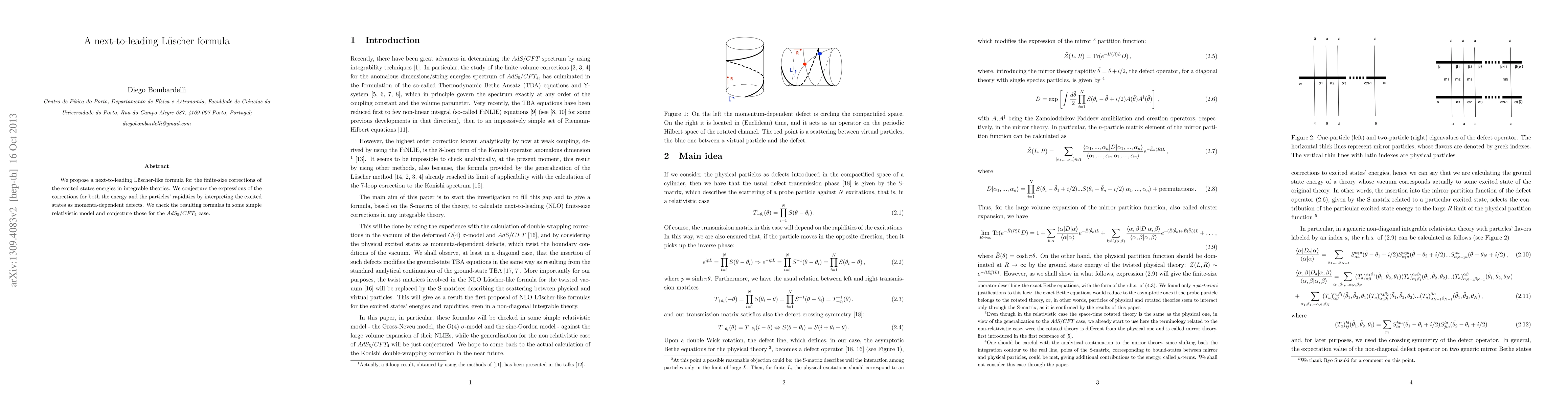 We propose a next-to-leading Luescher-like formula for the finite-size corrections of the excited states energies in integrable theories. We conjecture the expressions of the corrections for both the energy and the particles' rapidities by interpreting the excited states as momenta-dependent defects. We check the resulting formulas in some simple relativistic model and conjecture those for the AdS5/CFT4 case.