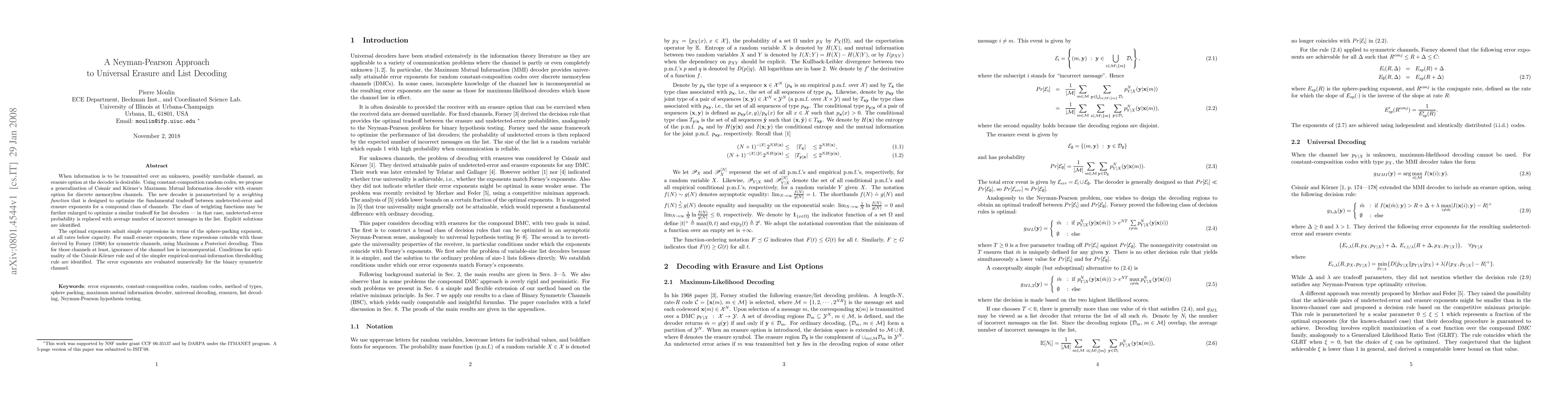 When information is to be transmitted over an unknown, possibly unreliable channel, an erasure option at the decoder is desirable. Using constant-composition random codes, we propose a generalization of Csiszar and Korner's Maximum Mutual Information decoder with erasure option for discrete memoryless channels. The new decoder is parameterized by a weighting function that is designed to optimize the fundamental tradeoff between undetected-error and erasure exponents for a compound class of channels. The class of weighting functions may be further enlarged to optimize a similar tradeoff for list decoders -- in that case, undetected-error probability is replaced with average number of incorrect messages in the list. Explicit solutions are identified. The optimal exponents admit simple expressions in terms of the sphere-packing exponent, at all rates below capacity. For small erasure exponents, these expressions coincide with those derived by Forney (1968) for symmetric channels, using Maximum a Posteriori decoding. Thus for those channels at least, ignorance of the channel law is inconsequential. Conditions for optimality of the Csiszar-Korner rule and of the simpler empirical-mutual-information thresholding rule are identified. The error exponents are evaluated numerically for the binary symmetric channel.