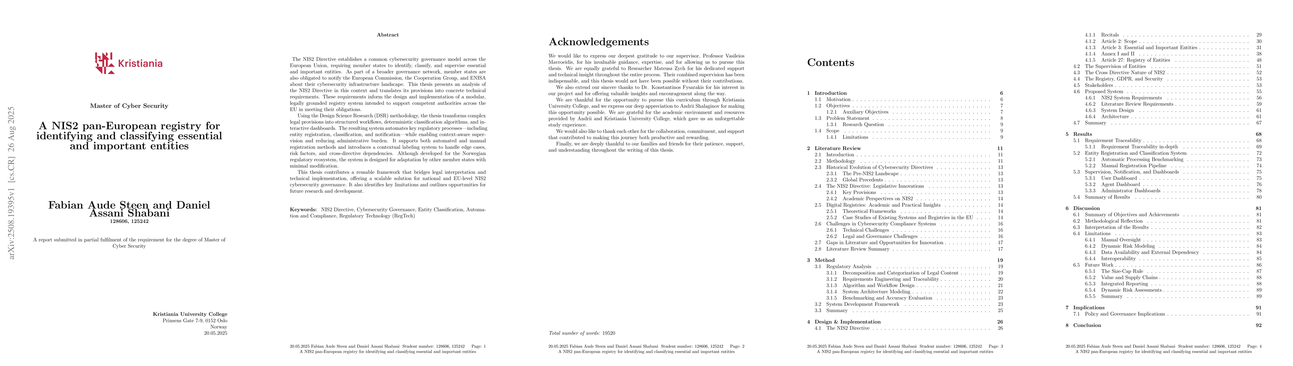 The NIS2 Directive establishes a common cybersecurity governance model across the European Union, requiring member states to identify, classify, and supervise essential and important entities. As part of a broader governance network, member states are also obligated to notify the European Commission, the Cooperation Group, and ENISA about their cybersecurity infrastructure landscape. This thesis presents an analysis of the NIS2 Directive in this context and translates its provisions into concrete technical requirements. These requirements inform the design and implementation of a modular, legally grounded registry system intended to support competent authorities across the EU in meeting their obligations. Using the Design Science Research methodology, the thesis transforms complex legal provisions into structured workflows, deterministic classification algorithms, and interactive dashboards. The resulting system automates key regulatory processes, including entity registration, classification, and notification, while enabling context-aware supervision and reducing administrative burden. It supports both automated and manual registration methods and introduces a contextual labeling system to handle edge cases, risk factors, and cross-directive dependencies. Although developed for the Norwegian regulatory ecosystem, the system is designed for adaptation by other member states with minimal modification. This thesis contributes a reusable framework that bridges legal interpretation and technical implementation, offering a scalable solution for national and EU-level NIS2 cybersecurity governance. It also identifies key limitations and outlines opportunities for future research and development.