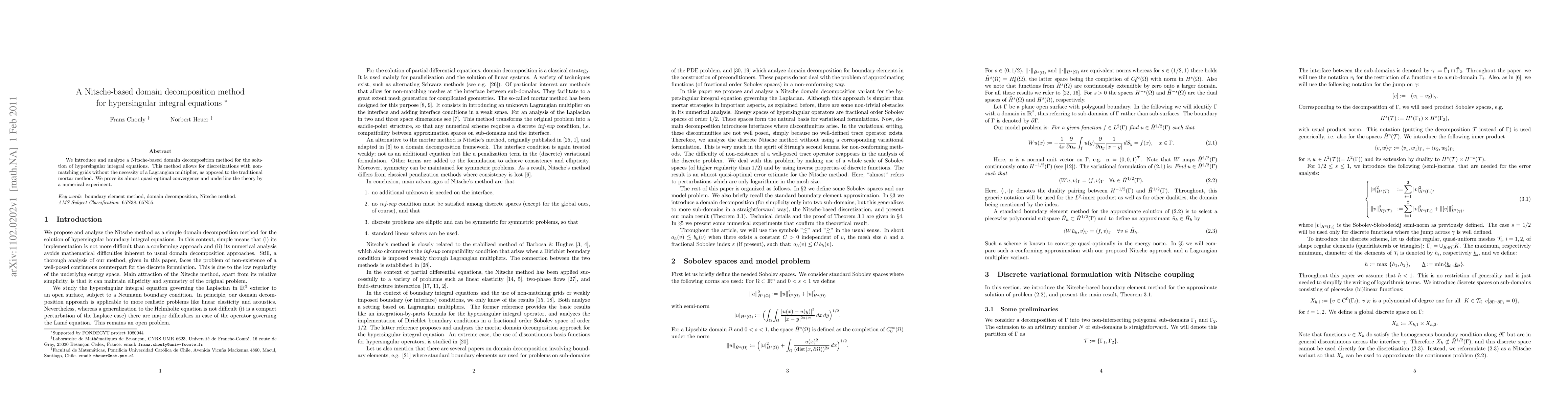 This paper presents a Nitsche-based domain decomposition method for solving hypersingular integral equations, enabling non-matching grid discretizations without Lagrangian multipliers. The method is shown to achieve almost quasi-optimal convergence, supported by a numerical experiment.