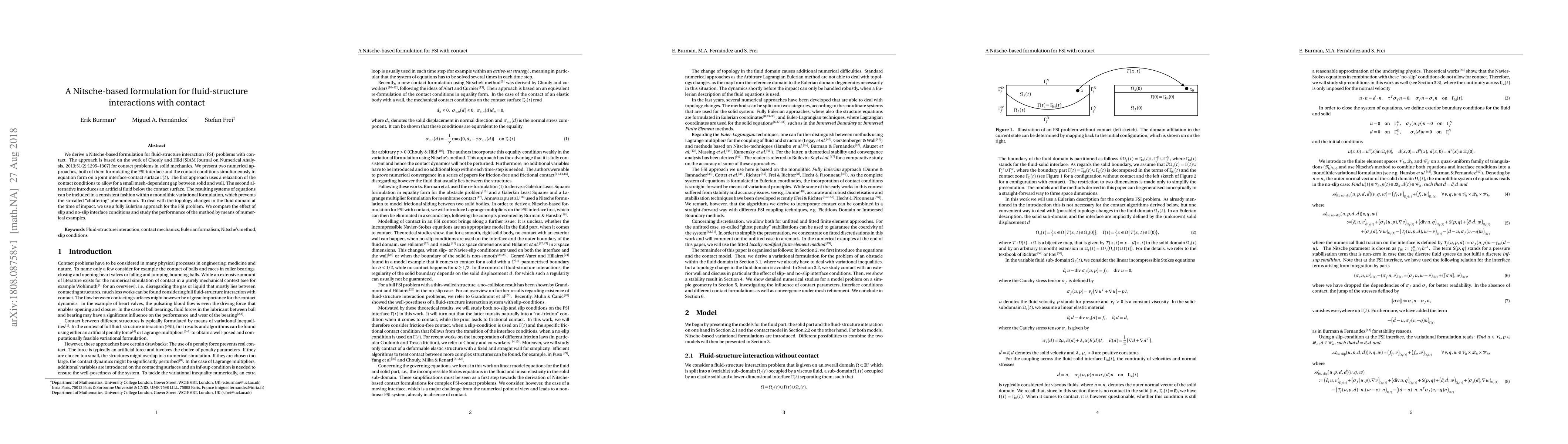 This paper presents a Nitsche-based formulation for fluid-structure interaction problems with contact, introducing two numerical approaches to handle the FSI interface and contact conditions. The methods are designed to prevent "chattering" and accommodate topology changes using a fully Eulerian approach.
