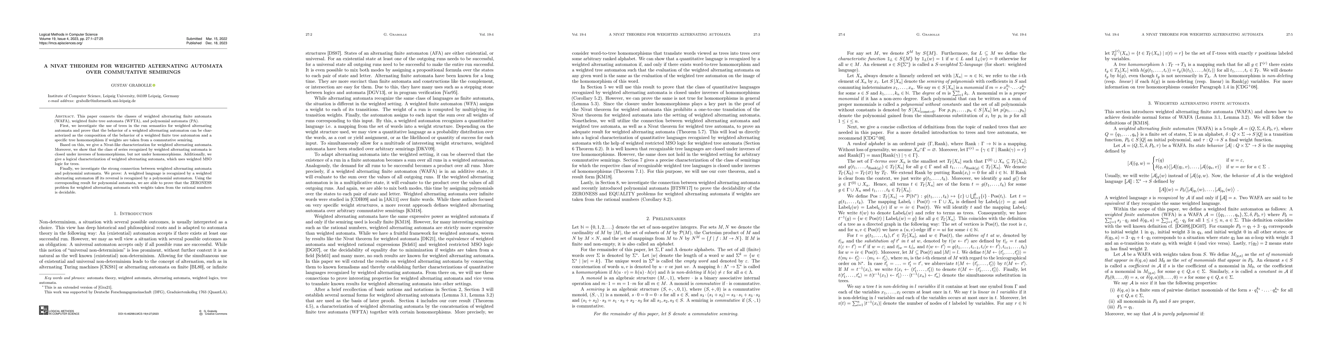 This paper establishes a Nivat-like theorem for weighted alternating automata over commutative semirings, showing they can be characterized through weighted finite tree automata and specific tree homomorphisms. It also demonstrates the connection between weighted alternating automata and polynomial automata, proving decidability of the ZERONESS problem for rational weights.