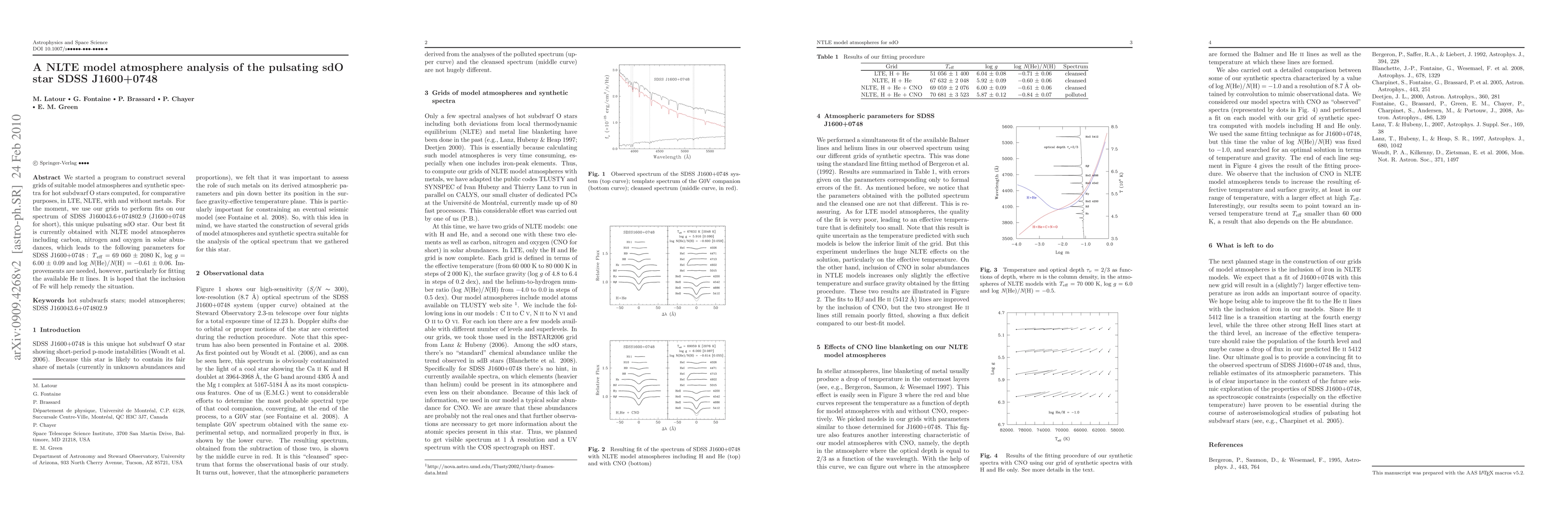 We started a program to construct several grids of suitable model atmospheres and synthetic spectra for hot subdwarf O stars computed, for comparative purposes, in LTE, NLTE, with and without metals. For the moment, we use our grids to perform fits on our spectrum of SDSS J160043.6+074802.9 (J1600+0748 for short), this unique pulsating sdO star. Our best fit is currently obtained with NLTE model atmospheres including carbon, nitrogen and oxygen in solar abundances, which leads to the following parameters for SDSS J1600+0748 : Teff = 69 060 +/- 2080 K, log g = 6.00 +/- 0.09 and log N(He)/N(H) = -0.61 +/- 0.06. Improvements are needed, however, particularly for fitting the available He II lines. It is hoped that the inclusion of Fe will help remedy the situation.