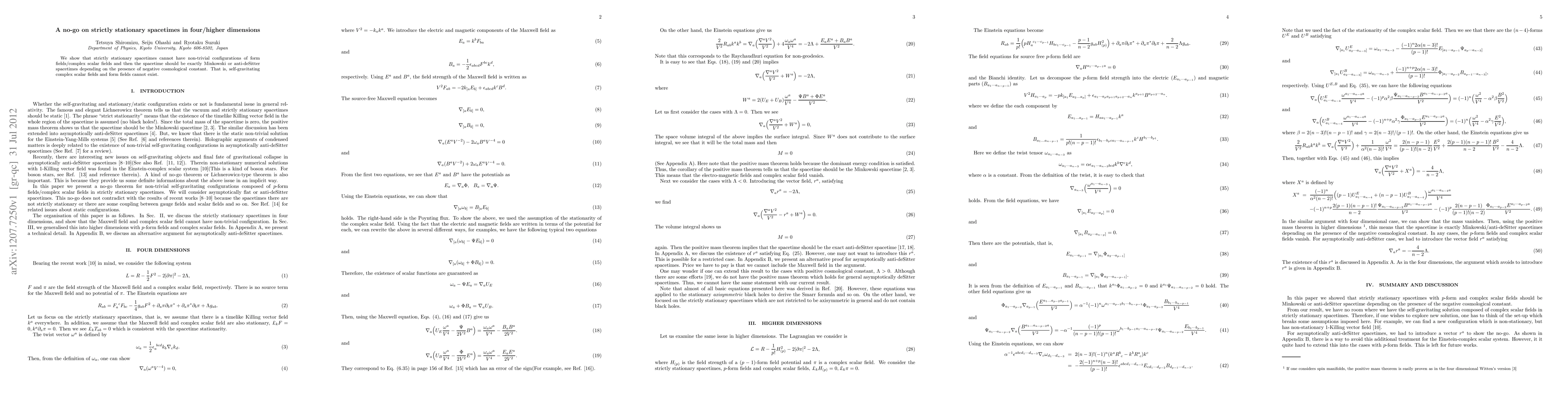 Summary: The research demonstrates that strictly stationary spacetimes in four or higher dimensions cannot support non-trivial configurations of form fields or complex scalar fields, leading to the conclusion that such spacetimes are either Minkowski or anti-deSitter, depending on the cosmological constant, with no room for self-gravitating complex scalar fields or form fields.