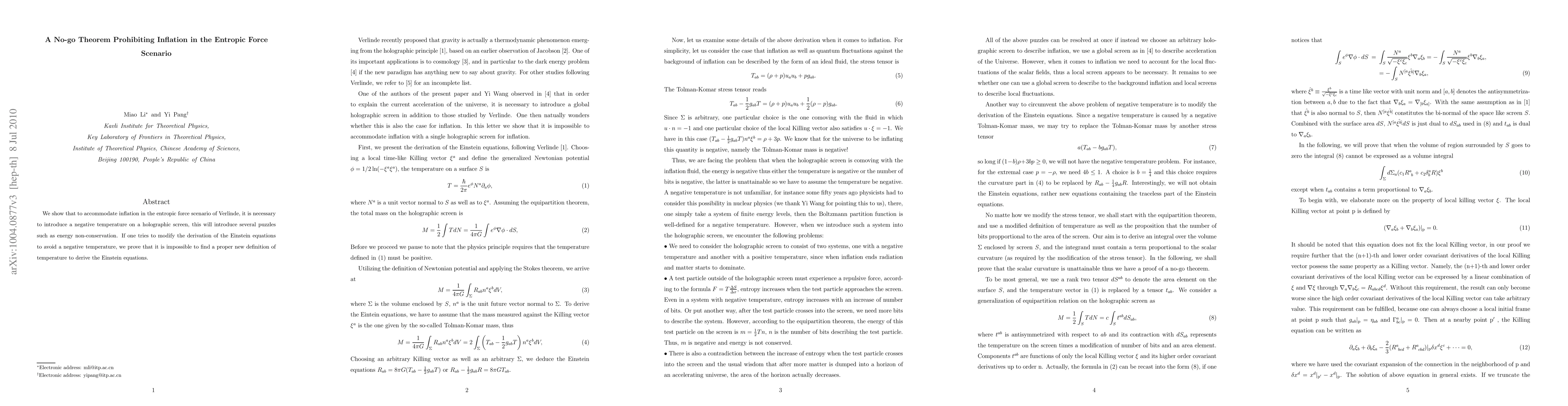 Summary: This paper demonstrates that inflation in Verlinde's entropic force scenario necessitates a negative temperature, leading to energy non-conservation issues. It proves that no new temperature definition can circumvent these problems, thus prohibiting inflation in this framework.