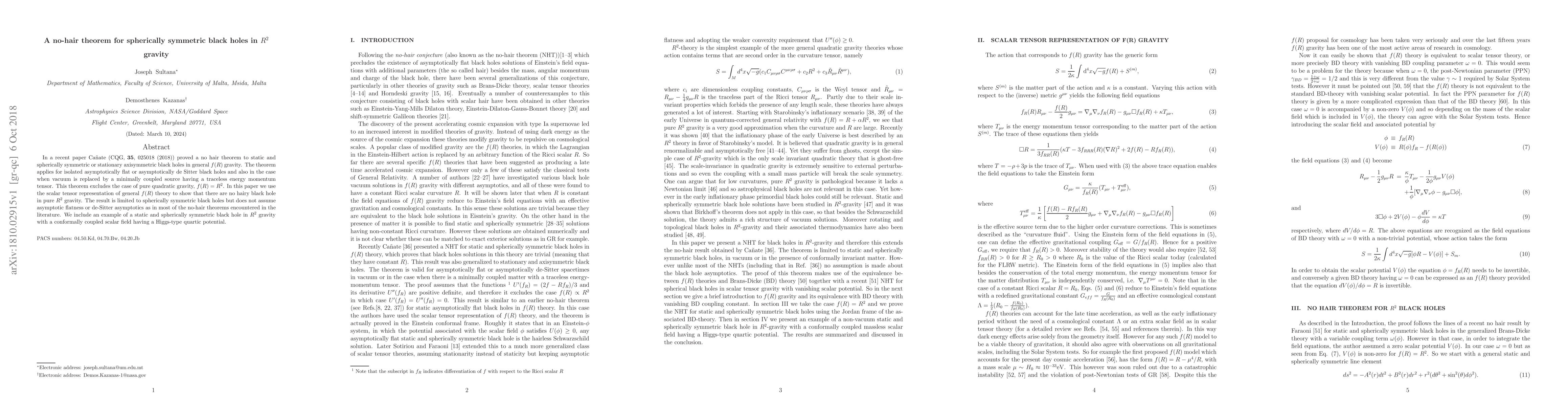 In a recent paper Ca\~nate (CQG, {\bf 35}, 025018 (2018)) proved a no hair theorem to static and spherically symmetric or stationary axisymmetric black holes in general $f(R)$ gravity. The theorem applies for isolated asymptotically flat or asymptotically de Sitter black holes and also in the case when vacuum is replaced by a minimally coupled source having a traceless energy momentum tensor. This theorem excludes the case of pure quadratic gravity, $f(R) = R^2$. In this paper we use the scalar tensor representation of general $f(R)$ theory to show that there are no hairy black hole in pure $R^2$ gravity. The result is limited to spherically symmetric black holes but does not assume asymptotic flatness or de-Sitter asymptotics as in most of the no-hair theorems encountered in the literature. We include an example of a static and spherically symmetric black hole in $R^2$ gravity with a conformally coupled scalar field having a Higgs-type quartic potential.